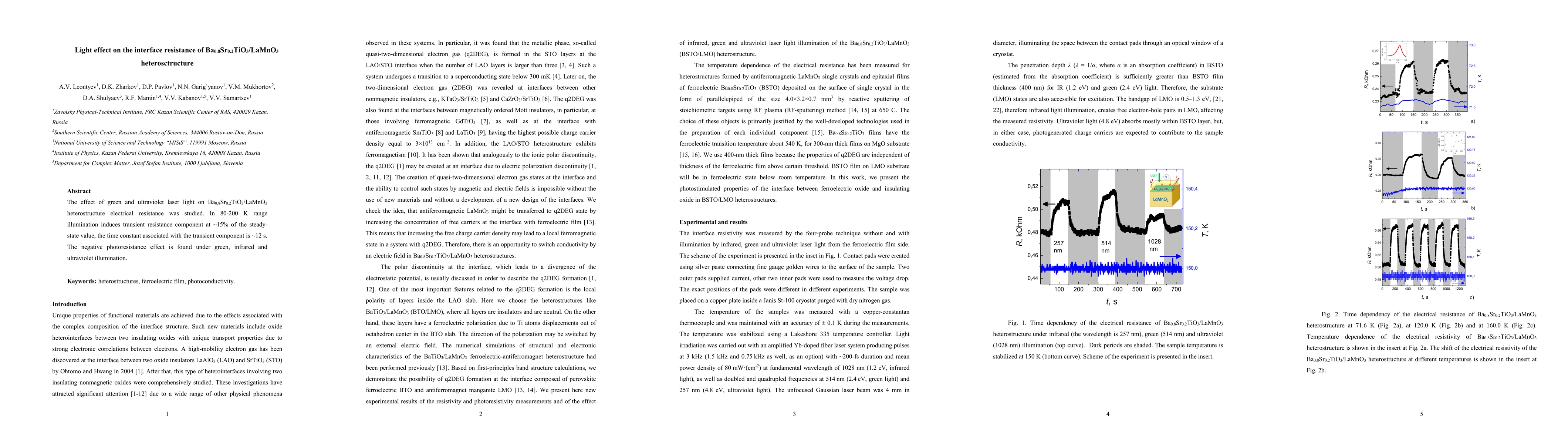 The study investigates the transient resistance changes in Ba$_{0.8}$Sr$_{0.2}$TiO$_3$/LaMnO$_3$ heterostructures under green and ultraviolet laser illumination, finding a ~15% transient resistance increase with a time constant of ~12 s, and a negative photoresistance effect across different light spectra.