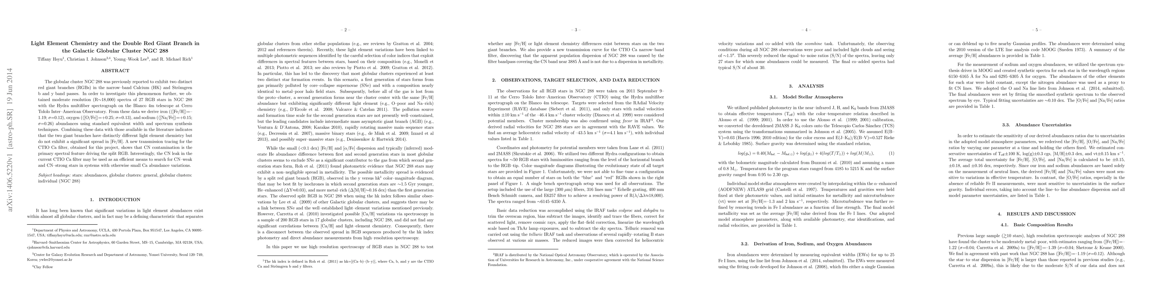 The globular cluster NGC 288 was previously reported to exhibit two distinct red giant branches (RGBs) in the narrow-band Calcium (HK) and Str\"omgren b and y band passes. In order to investigate this phenomenon further, we obtained moderate resolution (R$\sim$18,000) spectra of 27 RGB stars in NGC 288 with the Hydra multifiber spectrograph on the Blanco 4m telescope at Cerro Tololo Inter-American Observatory. From these data we derive iron ($\langle$[Fe/H]$\rangle$=-1.19; $\sigma$=0.12), oxygen ($\langle$[O/Fe]$\rangle$=$+$0.25; $\sigma$=0.13), and sodium ($\langle$[Na/Fe]$\rangle$=$+$0.15; $\sigma$=0.26) abundances using standard equivalent width and spectrum synthesis techniques. Combining these data with those available in the literature indicates that the two giant branches have distinctly different light element chemistry but do not exhibit a significant spread in [Fe/H]. A new transmission tracing for the CTIO Ca filter, obtained for this project, shows that CN contamination is the primary spectral feature driving the split RGB. Interestingly, the CN leak in the current CTIO Ca filter may be used as an efficient means to search for CN-weak and CN-strong stars in systems with otherwise small Ca abundance variations.