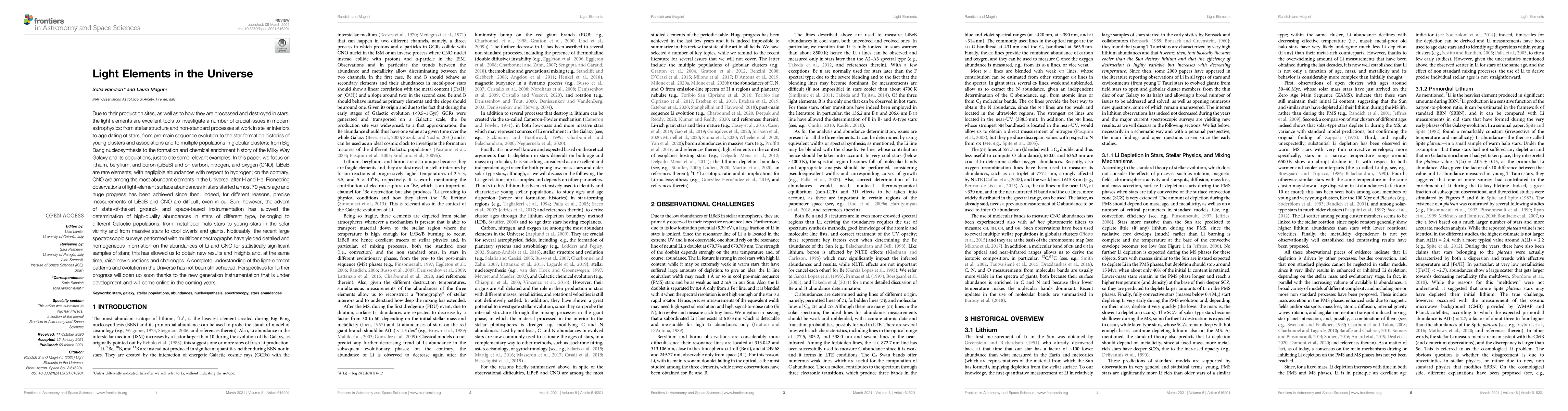 Due to their production sites, as well as to how they are processed and destroyed in stars, the light elements are excellent tools to investigate a number of crucial issues in modern astrophysics: from stellar structure and non-standard processes in stellar interiors to age dating of stars; from pre-main sequence evolution to the star formation histories of young clusters and associations and to multiple populations in globular clusters; from Big Bang nucleosynthesis to the formation and chemical enrichment history of the Milky Way Galaxy, just to cite some relevant examples. In this paper, we focus on lithium, beryllium, and boron and on carbon, nitrogen, and oxygen. LiBeB are rare elements, with negligible abundances with respect to hydrogen; on the contrary, CNO are among the most abundant elements in the Universe. Pioneering observations of light-element surface abundances in stars started almost 70 years ago and huge progress has been achieved since then. Indeed, for different reasons, precise measurements of LiBeB and CNO are difficult, even in our Sun; however, the advent of state-of-the-art ground- and space-based instrumentation has allowed the determination of high-quality abundances in stars of different type, belonging to different Galactic populations. Noticeably, the recent large spectroscopic surveys performed with multifiber spectrographs have yielded detailed and homogeneous information on the abundances of Li and CNO for statistically significant samples of stars; this has allowed us to obtain new results and insights and, at the same time, raise new questions and challenges. A complete understanding of the light-element patterns and evolution in the Universe has not been still achieved. Perspectives for further progress will open up soon thanks to the new generation instrumentation that is under development and will come online in the coming years.