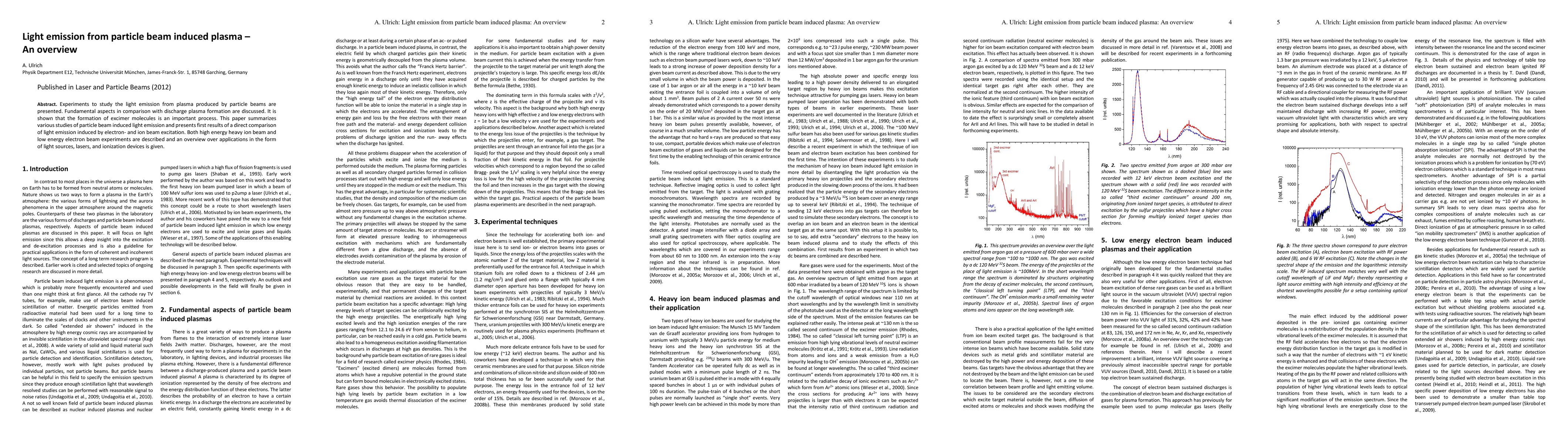 This paper reviews experiments on light emission from particle beam induced plasma, comparing it to discharge plasma, and highlights the role of excimer molecules. It presents a comparative study of light emission from electron and ion beams, detailing applications in light sources, lasers, and ionization devices.