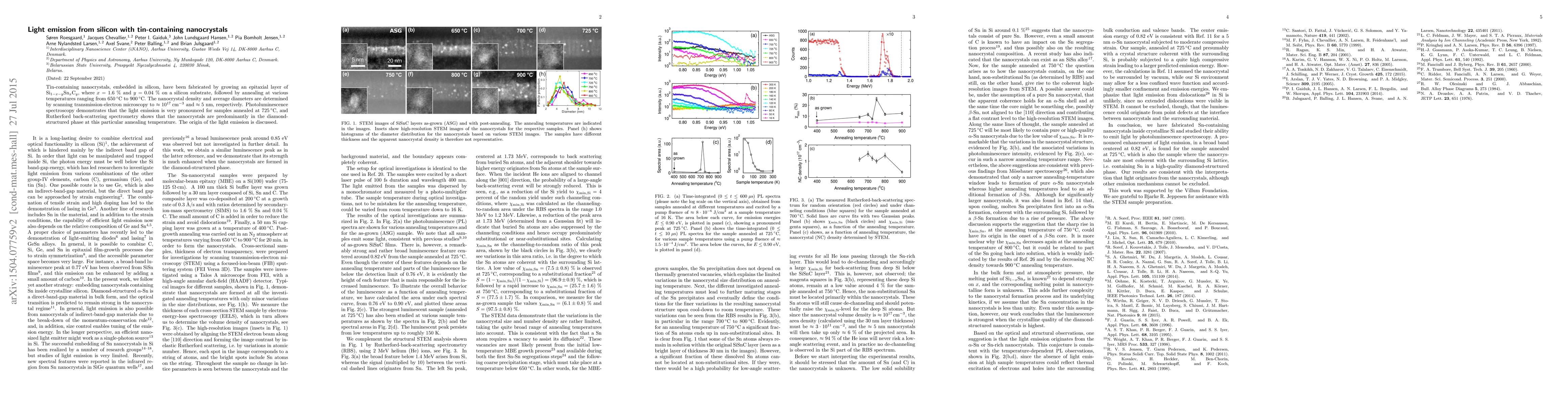 Tin-containing nanocrystals, embedded in silicon, have been fabricated by growing an epitaxial layer of Si_{1-x-y}Sn_{x}C_{y}, where x = 1.6 % and y = 0.04 %, followed by annealing at various temperatures ranging from 650 to 900 degrees C. The nanocrystal density and average diameters are determined by scanning transmission-electron microscopy to ~ 10^{17} cm^{-3} and ~ 5 nm, respectively. Photoluminescence spectroscopy demonstrates that the light emission is very pronounced for samples annealed at 725 degrees C, and Rutherford back-scattering spectrometry shows that the nanocrystals are predominantly in the diamond-structured phase at this particular annealing temperature. The origin of the light emission is discussed.