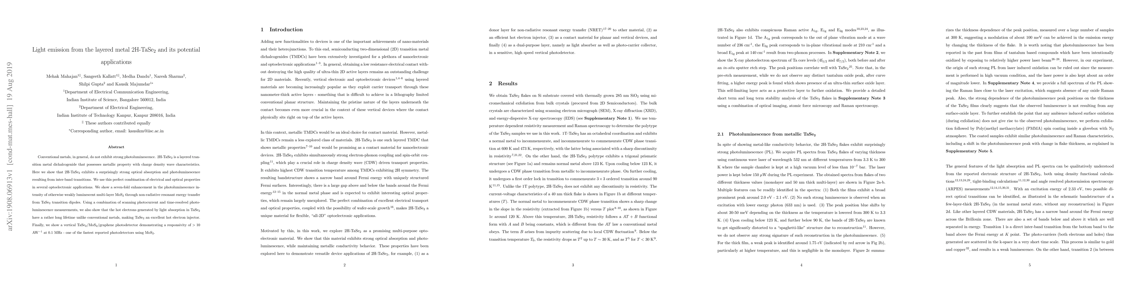 This study reveals strong photoluminescence in the layered metal 2H-TaSe$_2$, driven by inter-band transitions, and demonstrates its potential in optoelectronics, including a significant enhancement in multi-layer MoS$_2$ photoluminescence and a fast TaSe$_2$/MoS$_2$/graphene photodetector with high responsivity.
