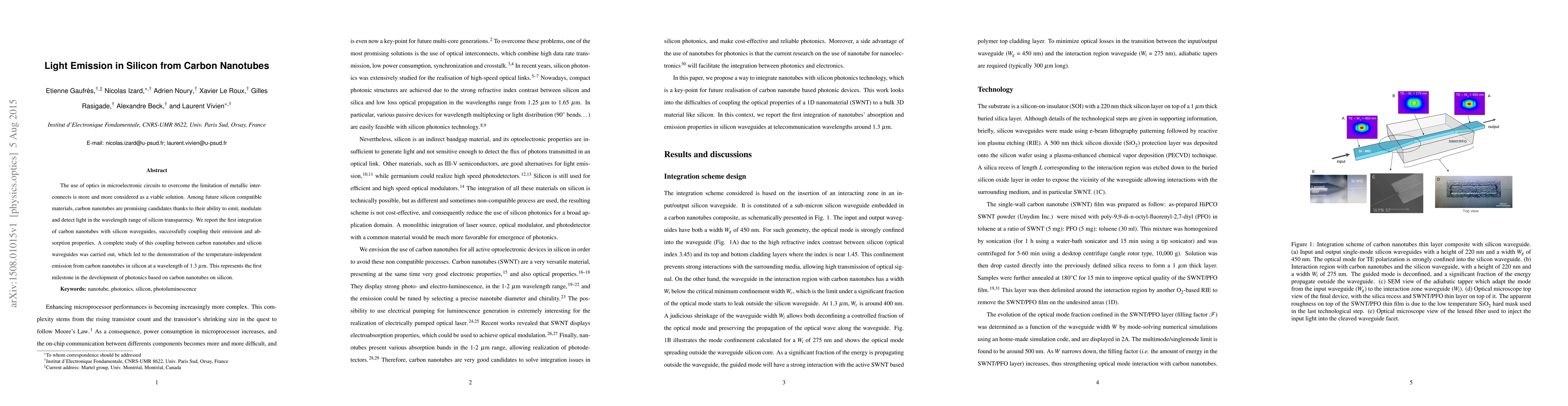This paper reports the successful integration of carbon nanotubes with silicon waveguides, demonstrating temperature-independent light emission at 1.3 μm. This marks a significant step forward in developing photonics technology using carbon nanotubes on silicon platforms.