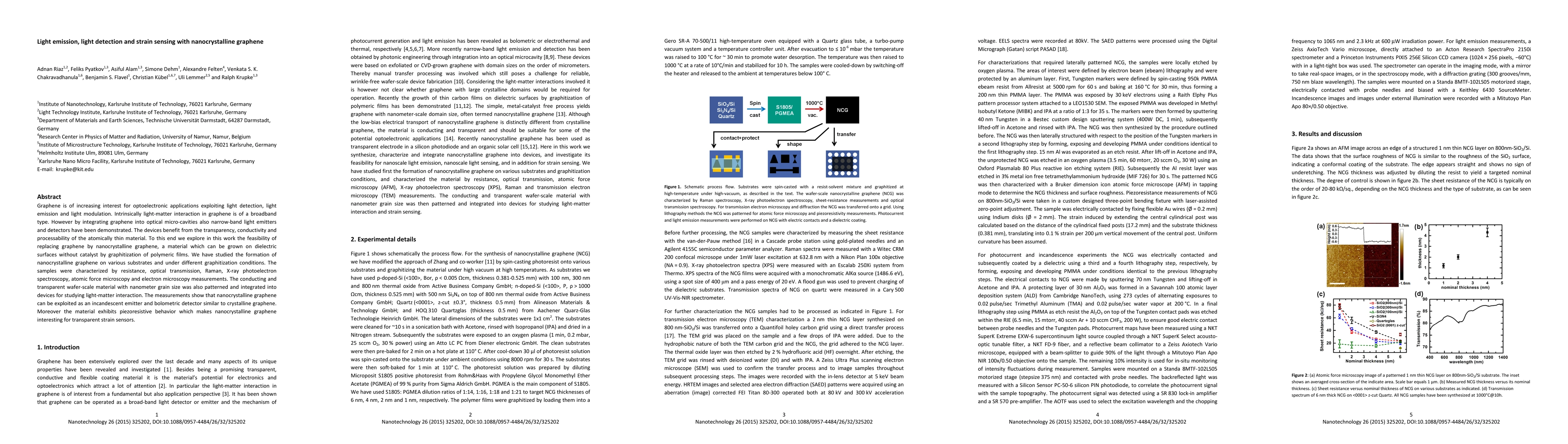 Graphene is of increasing interest for optoelectronic applications exploiting light detection, light emission and light modulation. Intrinsically light matter interaction in graphene is of a broadband type. However by integrating graphene into optical micro cavities also narrow band light emitters and detectors have been demonstrated. The devices benefit from the transparency, conductivity and processability of the atomically thin material. To this end we explore in this work the feasibility of replacing graphene by nanocrystalline graphene, a material which can be grown on dielectric surfaces without catalyst by graphitization of polymeric films. We have studied the formation of nanocrystalline graphene on various substrates and under different graphitization conditions. The samples were characterized by resistance, optical transmission, Raman, X-ray photoelectron spectroscopy, atomic force microscopy and electron microscopy measurements. The conducting and transparent wafer-scale material with nanometer grain size was also patterned and integrated into devices for studying light-matter interaction. The measurements show that nanocrystalline graphene can be exploited as an incandescent emitter and bolometric detector similar to crystalline graphene. Moreover the material exhibits piezoresistive behavior which makes nanocrystalline graphene interesting for transparent strain sensors.