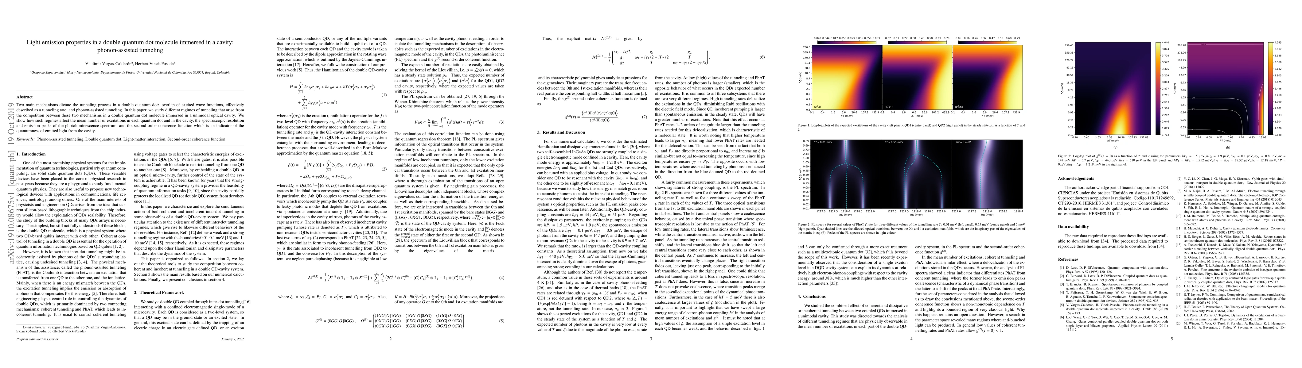 This paper investigates the light emission properties of a double quantum dot in a cavity, focusing on the competition between wave function overlap and phonon-assisted tunneling mechanisms. It examines how these mechanisms influence the mean excitation number, photoluminescence spectrum, and the quantum coherence of emitted light.