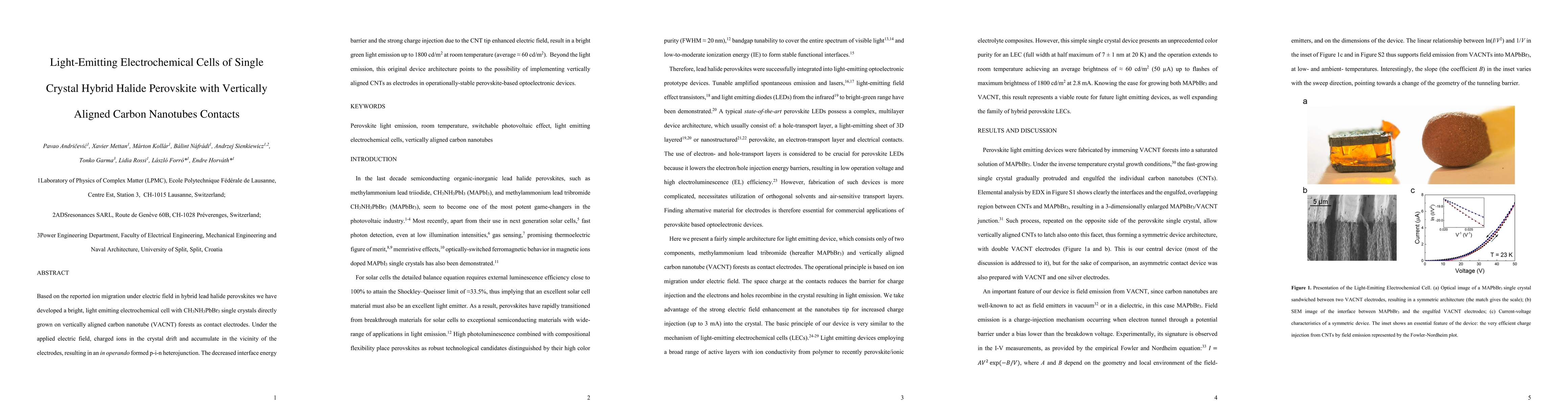 This paper reports the development of a bright light-emitting electrochemical cell using single crystal hybrid lead halide perovskites grown on vertically aligned carbon nanotubes. The device exhibits a bright green light emission up to 1800 cd/m² due to the formation of a p-i-n heterojunction and enhanced charge injection, suggesting potential for stable perovskite-based optoelectronics.