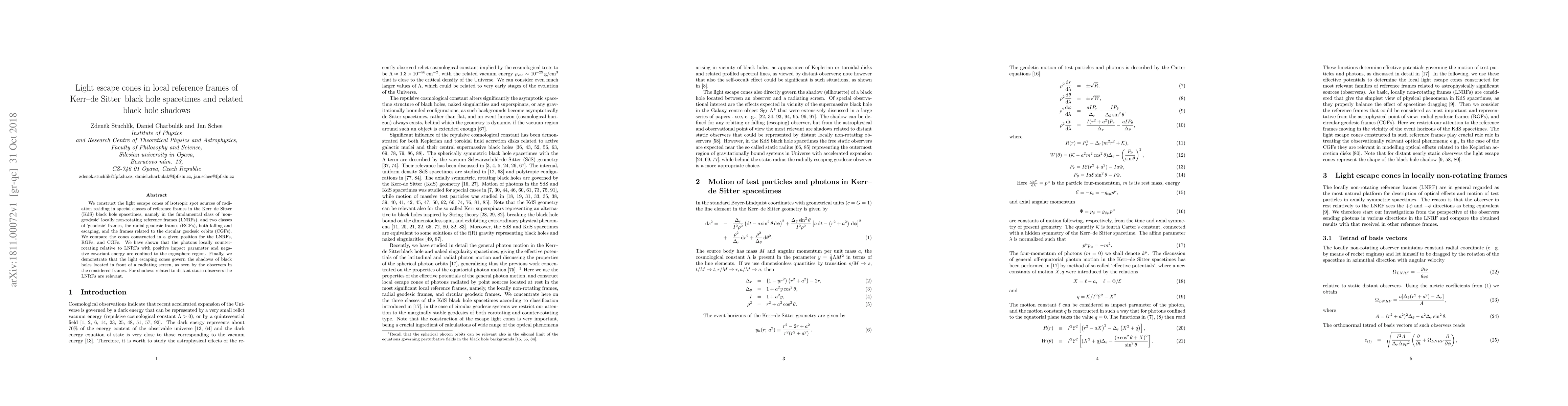 We construct the light escape cones of isotropic spot sources of radiation residing in special classes of reference frames in the Kerr-de Sitter (KdS) black hole spacetimes, namely, in the fundamental class of 'non-geodesic' locally non-rotating reference frames (LNRFs), and two classes of 'geodesic' frames, the radial geodesic frames (RGFs), both falling and escaping, and the frames related to the circular geodesic orbits (CGFs). We compare the cones constructed in a given position for the LNRFs, RGFs, and CGFs. We have shown that the photons locally counter-rotating relative to LNRFs with positive impact parameter and negative covariant energy are confined to the ergosphere region. Finally, we demonstrate that the light escaping cones govern the shadows of black holes located in front of a radiating screen, as seen by the observers in the considered frames. For shadows related to distant static observers the LNRFs are relevant.