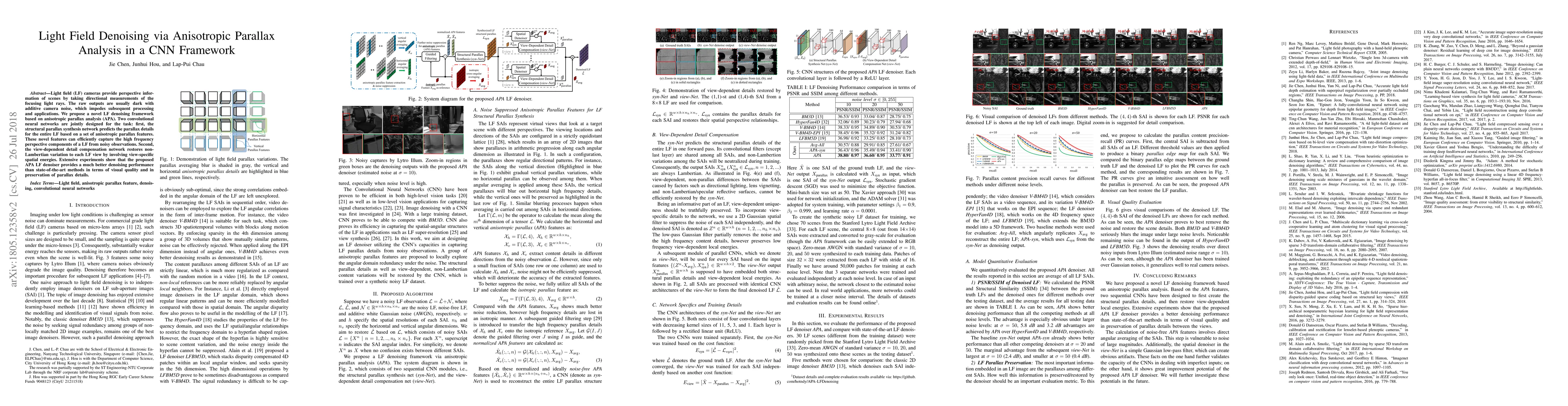 Light field (LF) cameras provide perspective information of scenes by taking directional measurements of the focusing light rays. The raw outputs are usually dark with additive camera noise, which impedes subsequent processing and applications. We propose a novel LF denoising framework based on anisotropic parallax analysis (APA). Two convolutional neural networks are jointly designed for the task: first, the structural parallax synthesis network predicts the parallax details for the entire LF based on a set of anisotropic parallax features. These novel features can efficiently capture the high frequency perspective components of a LF from noisy observations. Second, the view-dependent detail compensation network restores non-Lambertian variation to each LF view by involving view-specific spatial energies. Extensive experiments show that the proposed APA LF denoiser provides a much better denoising performance than state-of-the-art methods in terms of visual quality and in preservation of parallax details.