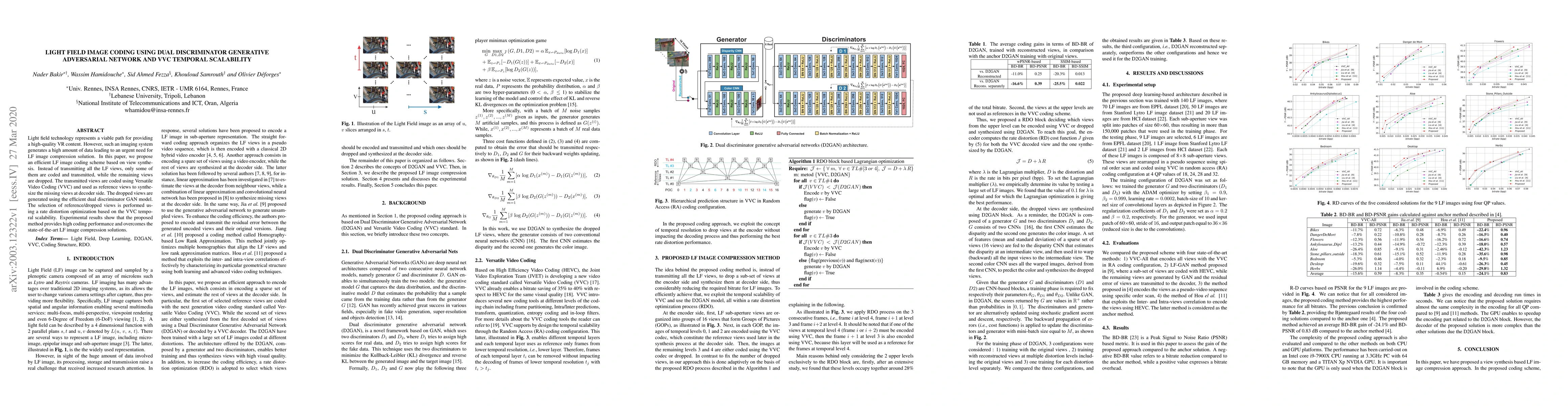 This paper proposes an efficient light field image coding scheme using a dual discriminator GAN and VVC temporal scalability. It selectively codes and transmits some light field views, synthesizing the rest using the GAN, achieving superior coding performance compared to existing methods.