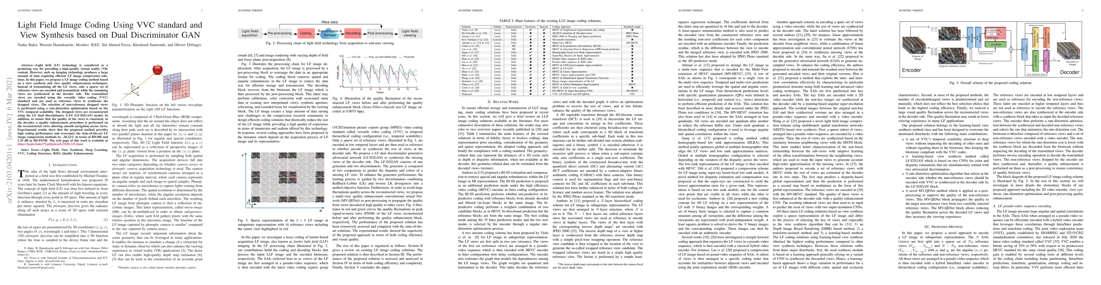 Light field (LF) technology is considered as a promising way for providing a high-quality virtual reality (VR) content. However, such an imaging technology produces a large amount of data requiring efficient LF image compression solutions. In this paper, we propose a LF image coding method based on a view synthesis and view quality enhancement techniques. Instead of transmitting all the LF views, only a sparse set of reference views are encoded and transmitted, while the remaining views are synthesized at the decoder side. The transmitted views are encoded using the versatile video coding (VVC) standard and are used as reference views to synthesize the dropped views. The selection of non-reference dropped views is performed using a rate-distortion optimization based on the VVC temporal scalability. The dropped views are reconstructed using the LF dual discriminator GAN (LF-D2GAN) model. In addition, to ensure that the quality of the views is consistent, at the decoder, a quality enhancement procedure is performed on the reconstructed views allowing smooth navigation across views. Experimental results show that the proposed method provides high coding performance and overcomes the state-of-the-art LF image compression methods by -36.22% in terms of BD-BR and 1.35 dB in BD-PSNR. The web page of this work is available at https://naderbakir79.github.io/LFD2GAN.html.