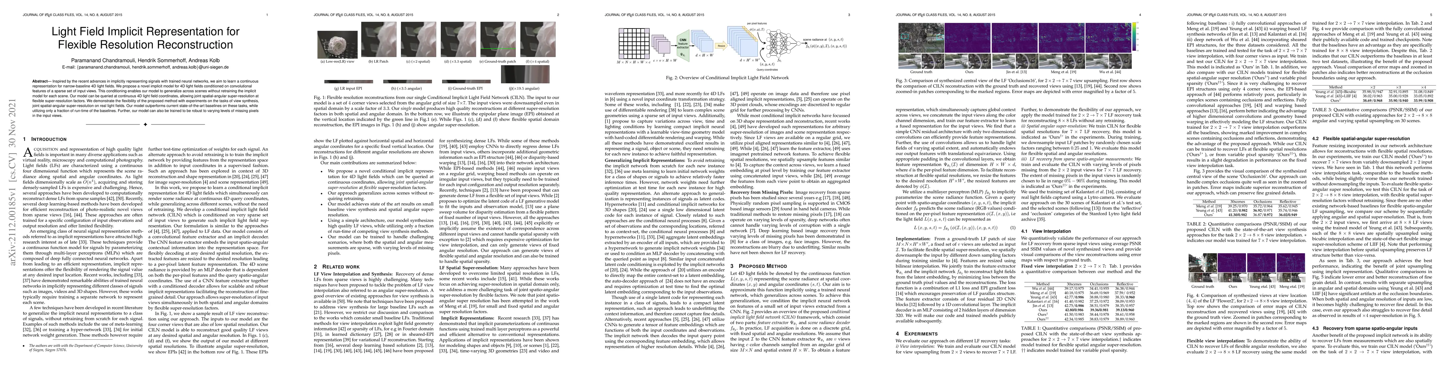 This paper proposes an implicit neural representation model for 4D light fields, trained on sparse input views to enable flexible resolution reconstruction. It achieves state-of-the-art view synthesis performance and can handle low-resolution or incomplete input data efficiently.
