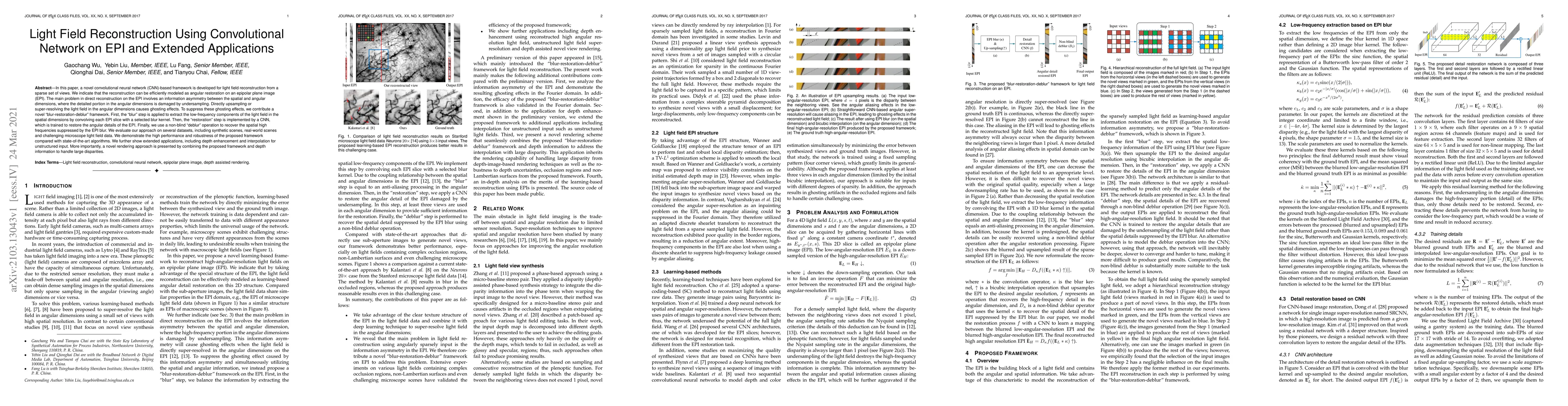 This paper proposes a CNN-based framework for light field reconstruction from sparse views, addressing information asymmetry and ghosting effects through a "blur-restoration-deblur" approach. The method demonstrates high performance and robustness across various datasets and extends to applications like depth enhancement and rendering with large disparities.
