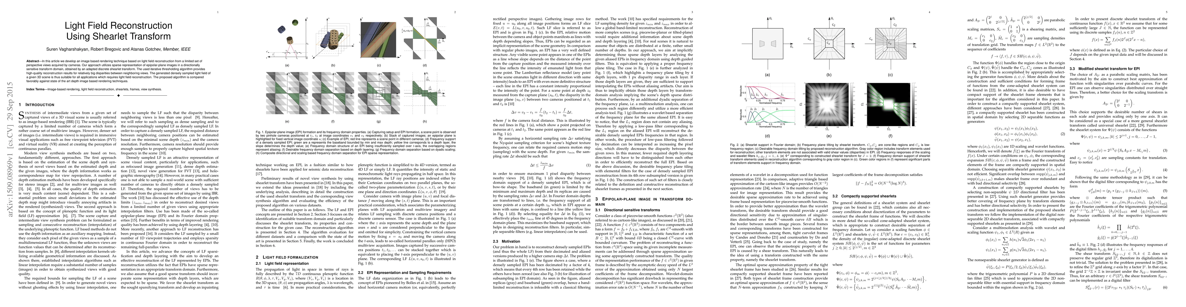 The paper presents a light field reconstruction technique using shearlet transform, which provides sparse representation of epipolar-plane images (EPIs). It employs an iterative thresholding algorithm for reconstruction, specifically designed for handling big disparities between neighboring views.