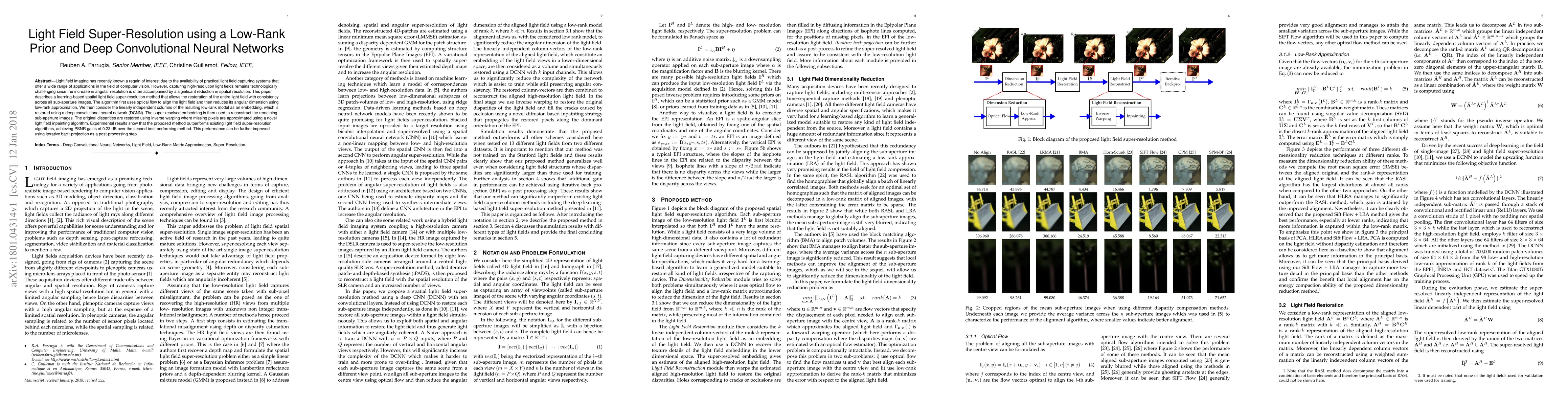 This paper proposes a learning-based method for light field super-resolution using low-rank priors and deep convolutional neural networks, achieving higher PSNR gains compared to existing methods. The approach aligns the light field via optical flow, reduces angular dimensions with low-rank approximation, and reconstructs high-resolution sub-aperture images using a DCNN and light field inpainting.