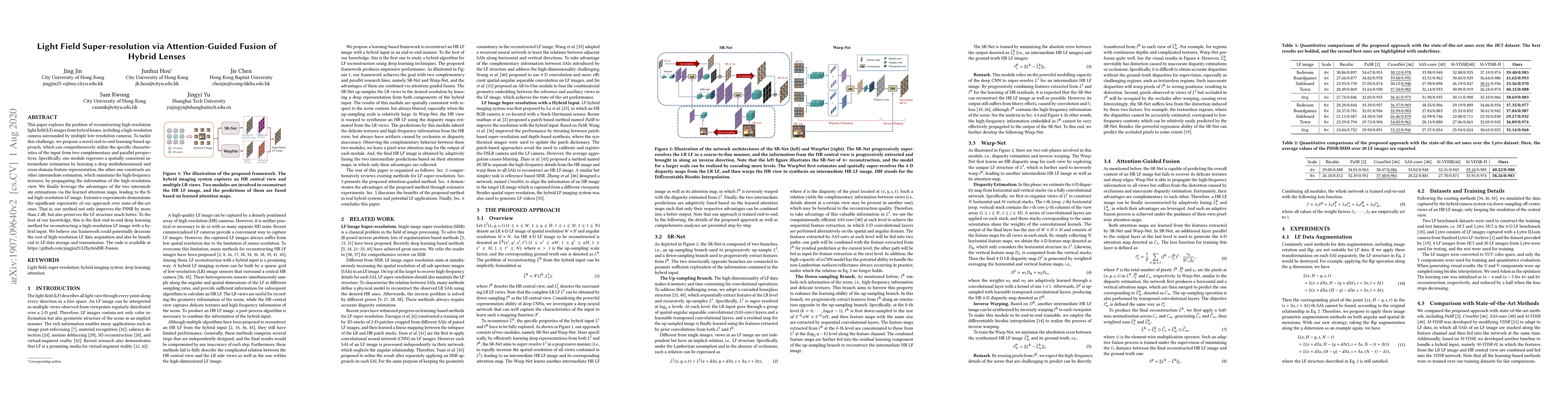 This paper proposes a novel end-to-end deep learning method for reconstructing high-resolution light field images from hybrid lenses, leveraging attention-guided fusion to improve PSNR by over 2 dB and better preserve light field structures. The method combines intermediate estimations from high-resolution and low-resolution inputs to achieve superior results compared to state-of-the-art.