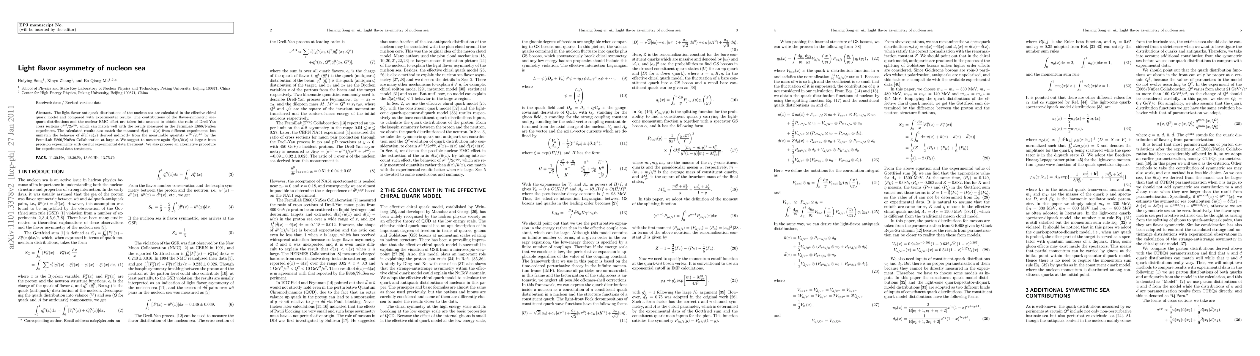 The light flavor antiquark distributions of the nucleon sea are calculated in the effective chiral quark model and compared with experimental results. The contributions of the flavor-symmetric sea-quark distributions and the nuclear EMC effect are taken into account to obtain the ratio of Drell-Yan cross sections $\sigma^{\mathrm{pD}}/2\sigma^{\mathrm{pp}}$, which can match well with the results measured in the FermiLab E866/NuSea experiment. The calculated results also match the measured $\bar{d}(x)-\bar{u}(x)$ from different experiments, but unmatch the behavior of $\bar{d}(x)/\bar{u}(x)$ derived indirectly from the measurable quantity $\sigma^{\mathrm{pD}}/2\sigma^{\mathrm{pp}}$ by the FermiLab E866/NuSea Collaboration at large $x$. We suggest to measure again $\bar{d}(x)/\bar{u}(x)$ at large $x$ from precision experiments with careful experimental data treatment. We also propose an alternative procedure for experimental data treatment.