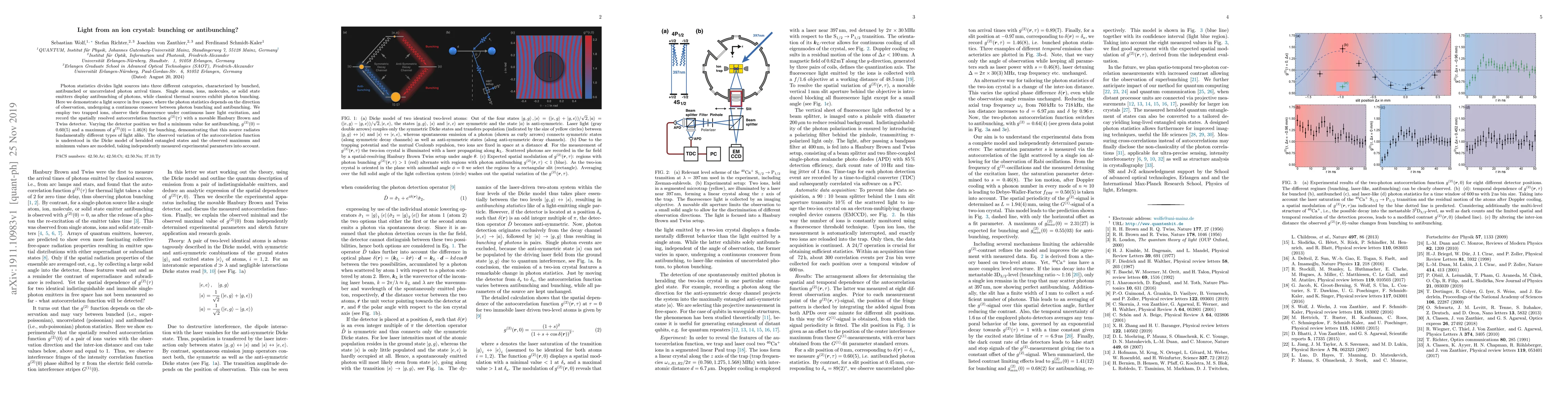 Photon statistics divides light sources into three different categories, characterized by bunched, antibunched or uncorrelated photon arrival times. Single atoms, ions, molecules, or solid state emitters display antibunching of photons, while classical thermal sources exhibit photon bunching. Here we demonstrate a light source in free space, where the photon statistics depends on the direction of observation, undergoing a continuous crossover between photon bunching and antibunching. We employ two trapped ions, observe their fluorescence under continuous laser light excitation, and record the spatially resolved autocorrelation function $g^{(2)}(\tau)$ with a movable Hanbury Brown and Twiss detector. Varying the detector position we find a minimum value for antibunching, $g^{(2)}(0) = 0.60(5)$ and a maximum of $g^{(2)}(0)=1.46(8)$ for bunching, demonstrating that this source radiates fundamentally different types of light alike. The observed variation of the autocorrelation function is understood in the Dicke model of heralded entangled states and the observed maximum and minimum values are modeled, taking independently measured experimental parameters into account.