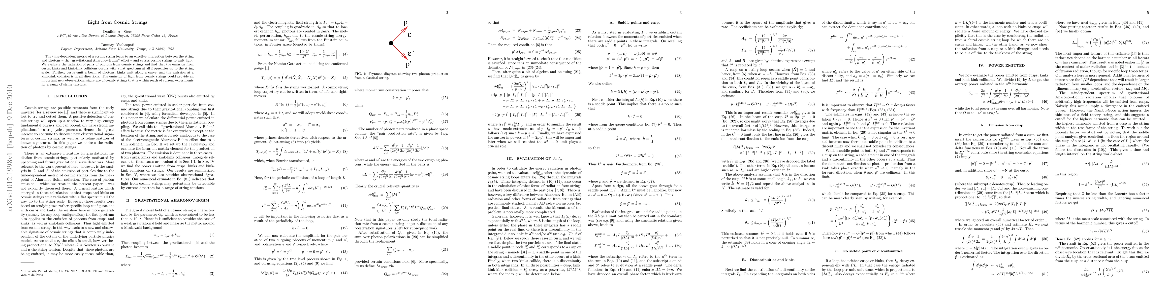 The research investigates the light emission from cosmic strings due to the "gravitational Aharonov-Bohm" effect, revealing distinct radiation patterns from cusps, kinks, and kink-kink collisions, with potential observational implications for detecting cosmic strings using current experiments.
