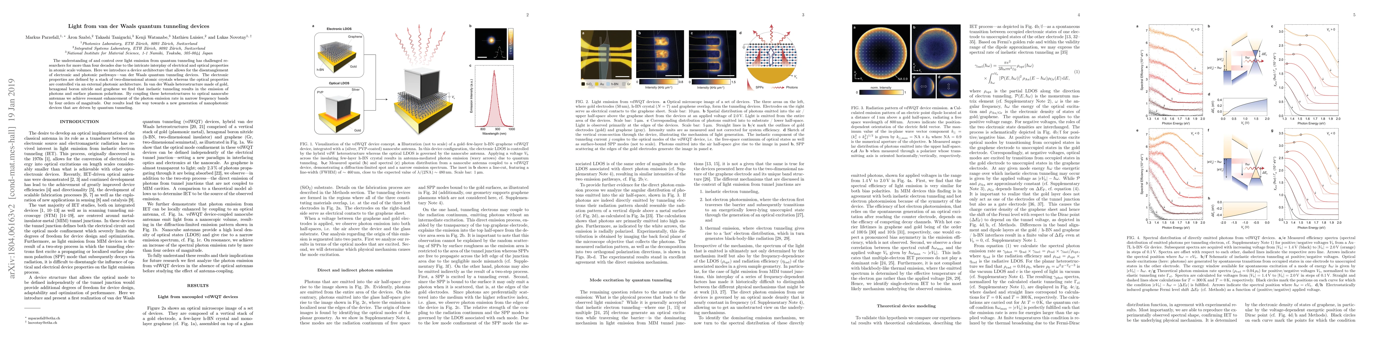 This paper presents a novel van der Waals quantum tunneling device architecture that separates electronic and photonic pathways, achieving significant enhancement of photon emission through resonant coupling with optical nanocube antennas. The study demonstrates the potential for next-generation nanophotonic devices driven by quantum tunneling.