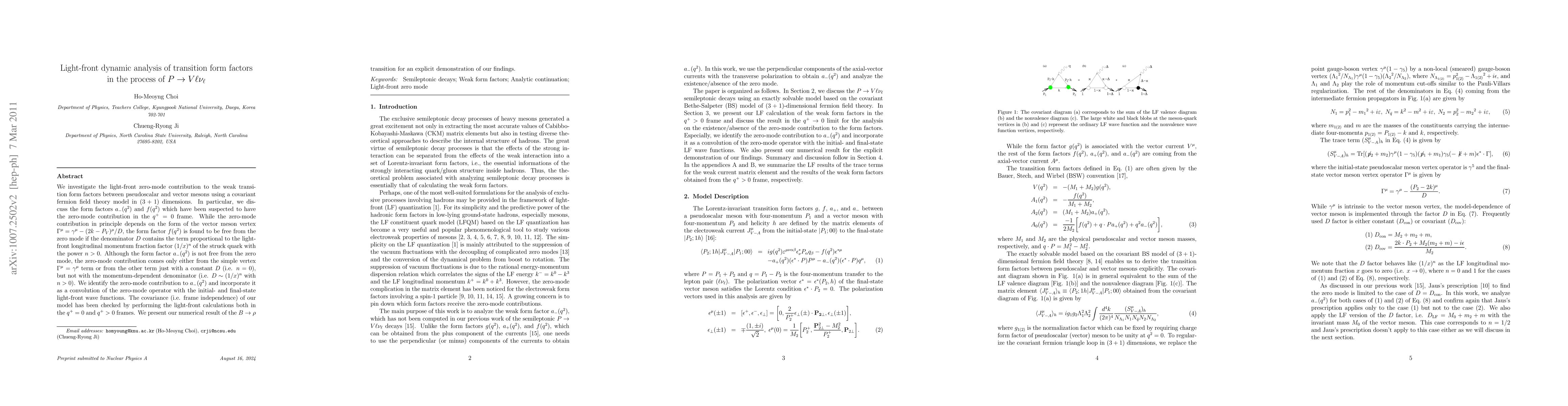 Researchers analyzed transition form factors in a particle decay using light-front zero-mode contributions from a covariant fermion field theory model, finding that these contributions depend on the vertex form of vector mesons.
