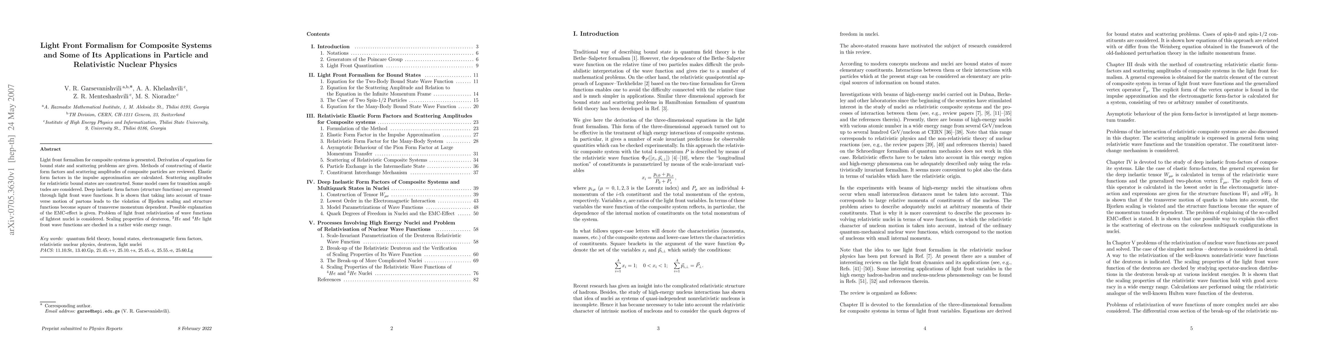 Light front formalism for composite systems is presented. Derivation of equations for bound state and scattering problems are given. Methods of constructing of elastic form factors and scattering amplitudes of composite particles are reviewed. Elastic form factors in the impulse approximation are calculated. Scattering amplitudes for relativistic bound states are constructed. Some model cases for transition amplitudes are considered. Deep inelastic form factors (structure functions) are expressed through light front wave functions. It is shown that taking into account of transverse motion of partons leads to the violation of Bjorken scaling and structure functions become square of transverse momentum dependent. Possible explanation of the EMC-effect is given. Problem of light front relativization of wave functions of lightest nuclei is considered. Scaling properties of deuteron, ${}^3He$ and ${}^4He$ light front wave functions are checked in a rather wide energy range.
