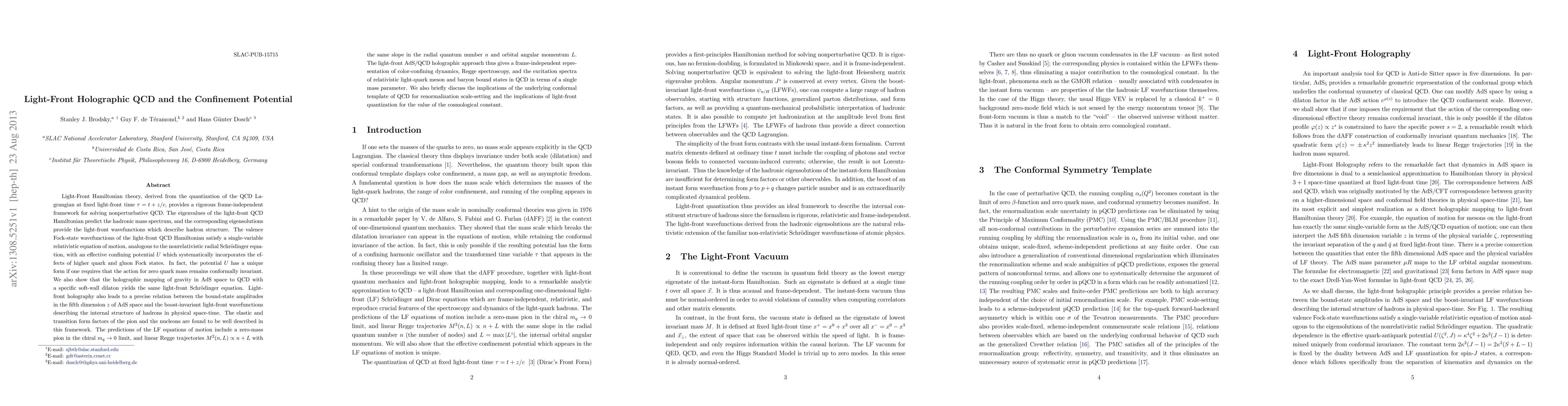 Light-Front Hamiltonian theory, derived from the quantization of the QCD Lagrangian at fixed light-front time \tau = t+z/c, provides a rigorous frame-independent framework for solving nonperturbative QCD. The eigenvalues of the light-front QCD Hamiltonian predict the hadronic mass spectrum, and the eigensolutions provide the light-front wavefunctions describing hadron structure. The valence Fock-state wavefunctions of the light-front QCD Hamiltonian satisfy a single-variable relativistic equation of motion, analogous to the nonrelativistic radial Schrodinger equation, with an effective confining potential U which systematically incorporates the effects of higher quark and gluon Fock states. The potential U has a unique form if one requires that the action for zero quark mass remains conformally invariant. The holographic mapping of gravity in AdS space to QCD with a specific soft-wall dilaton yields the same light-front Schrodinger equation. It also gives a precise relation between the bound-state amplitudes in the fifth dimension z of AdS space and the boost-invariant light-front wavefunctions describing the internal structure of hadrons in physical space-time. The elastic and transition form factors of the pion and the nucleons are found to be well described in this framework. The predictions include a zero-mass pion in the chiral limit, and linear Regge trajectories with the same slope in the radial quantum number n and orbital angular momentum L. The light-front AdS/QCD holographic approach thus gives a frame-independent representation of color-confining dynamics and the excitation spectra of light-quark hadrons in terms of a single mass parameter. We also discuss the implications of the underlying conformal template of QCD for renormalization scale-setting and the implications of light-front quantization for the value of the cosmological constant.