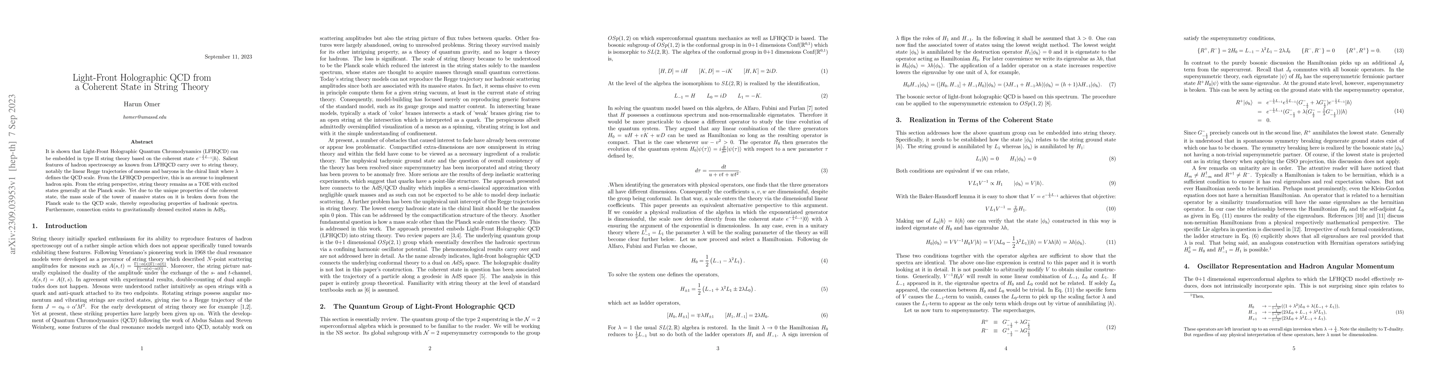 It is shown that Light-Front Holographic Quantum Chromodynamics (LFHQCD) can be embedded in type II string theory based on the coherent state $e^{-\frac{1}{\lambda} L_{-1}}|h\rangle$. Salient features of hadron spectroscopy as known from LFHQCD carry over to string theory, notably the linear Regge trajectories of mesons and baryons in the chiral limit where $\lambda$ defines the QCD scale. From the LFHQCD perspective, this is an avenue to implement hadron spin. From the string perspective, string theory remains as a TOE with excited states generally at the Planck scale. Yet due to the unique properties of the coherent state, the mass scale of the tower of massive states on it is broken down from the Planck scale to the QCD scale, thereby reproducing properties of hadronic spectra. Furthermore, connection exists to gravitationally dressed excited states in AdS3.