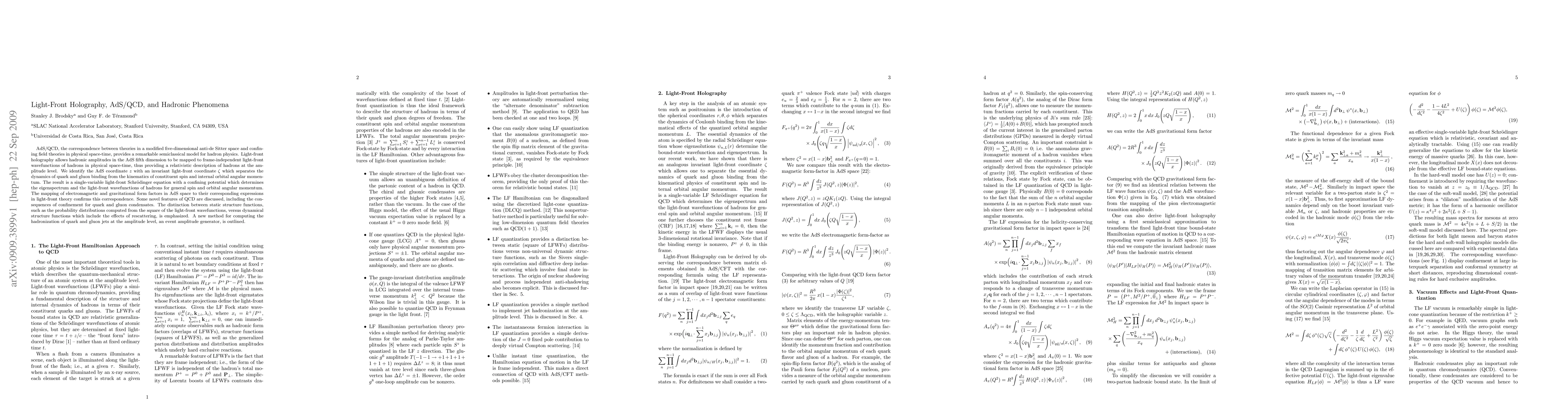 This paper explores the AdS/QCD model, linking five-dimensional anti-de Sitter space to confining field theories, and uses light-front holography to describe hadrons relativistically. It derives a single-variable light-front Schrödinger equation to determine hadron eigenspectra and wavefunctions, emphasizing the distinction between static and dynamical structure functions and introducing a new method for hadron jet computations.