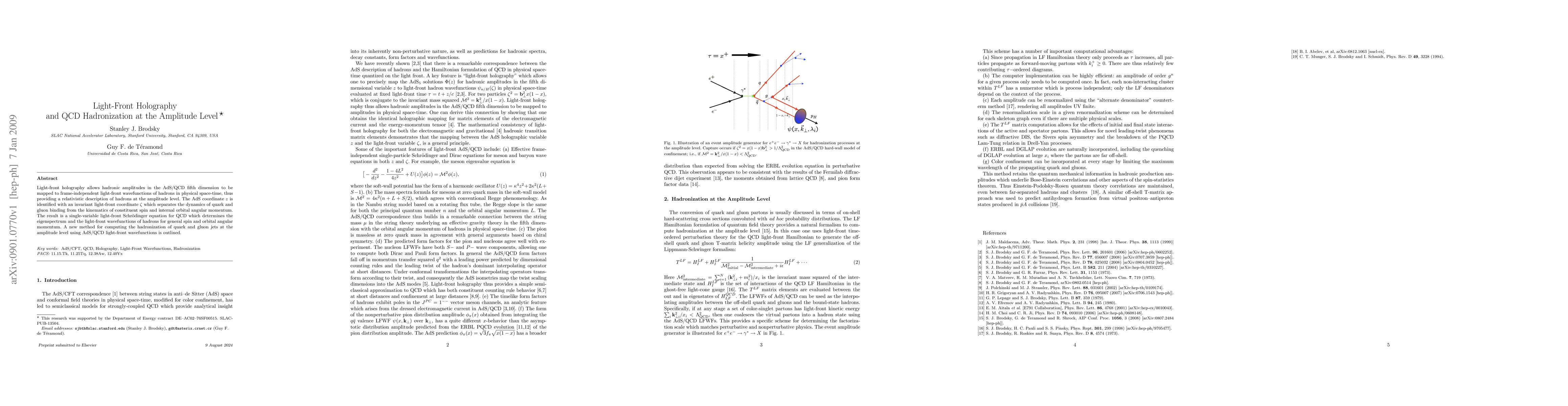 Light-front holography allows hadronic amplitudes in the AdS/QCD fifth dimension to be mapped to frame-independent light-front wavefunctions of hadrons in physical space-time, thus providing a relativistic description of hadrons at the amplitude level. The AdS coordinate z is identified with an invariant light-front coordinate zeta which separates the dynamics of quark and gluon binding from the kinematics of constituent spin and internal orbital angular momentum. The result is a single-variable light-front Schrodinger equation for QCD which determines the eigenspectrum and the light-front wavefunctions of hadrons for general spin and orbital angular momentum. A new method for computing the hadronization of quark and gluon jets at the amplitude level using AdS/QCD light-front wavefunctions is outlined.
