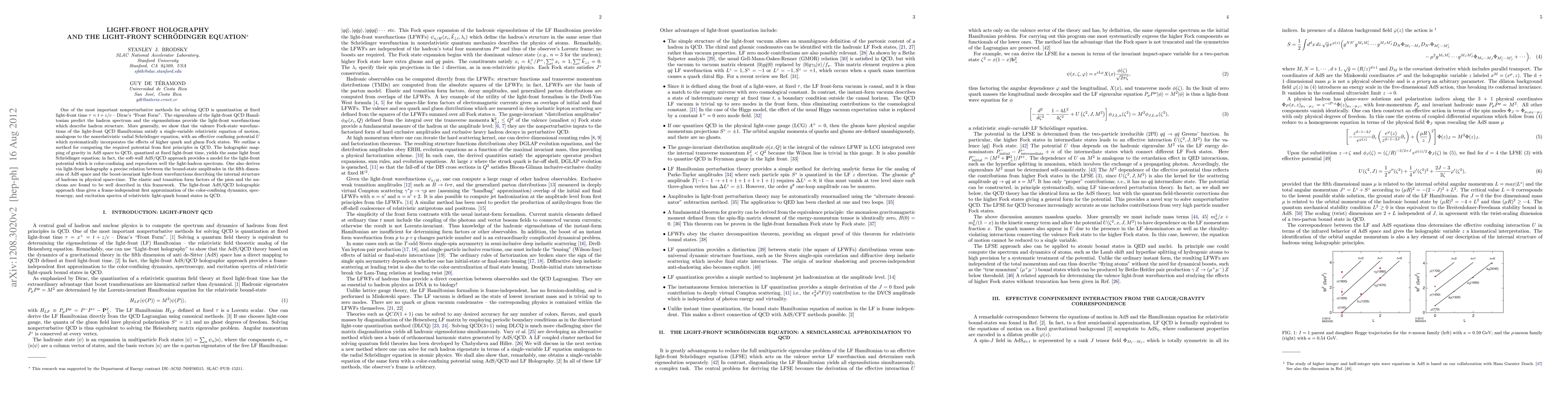 One of the most important nonperturbative methods for solving QCD is quantization at fixed light-front time, \tau = t+z/c -- Dirac's "Front Form". The eigenvalues of the light-front QCD Hamiltonian predict the hadron spectrum and the eigensolutions provide the light-front wavefunctions which describe hadron structure. More generally, we show that the valence Fock-state wavefunctions of the light-front QCD Hamiltonian satisfy a single-variable relativistic equation of motion, analogous to the nonrelativistic radial Schr\"odinger equation, with an effective confining potential U which systematically incorporates the effects of higher quark and gluon Fock states. We outline a method for computing the required potential from first principles in QCD. The holographic mapping of gravity in AdS space to QCD, quantized at fixed light-front time, yields the same light front Schr\"odinger equation; in fact, the soft-wall AdS/QCD approach provides a model for the light-front potential which is color-confining and reproduces well the light-hadron spectrum. One also derives via light-front holography a precise relation between the bound-state amplitudes in the fifth dimension of AdS space and the boost-invariant light-front wavefunctions describing the internal structure of hadrons in physical space-time. The elastic and transition form factors of the pion and the nucleons are found to be well described in this framework. The light-front AdS/QCD holographic approach thus gives a frame-independent first approximation of the color-confining dynamics, spectroscopy, and excitation spectra of relativistic light-quark bound states in QCD.