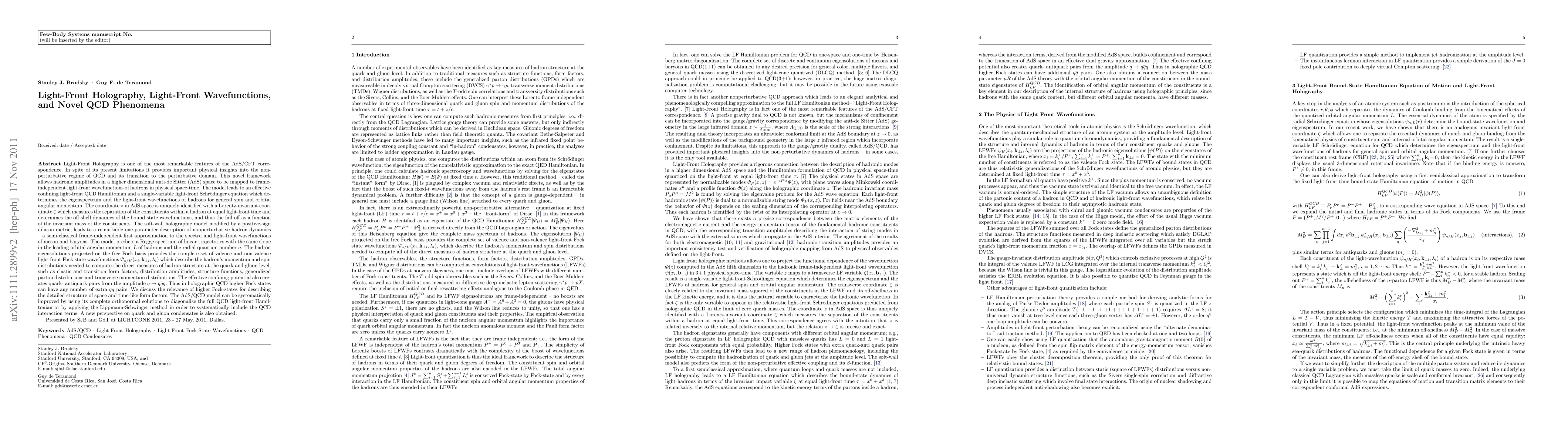 Light-Front Holography maps AdS space amplitudes to light-front wavefunctions, yielding a light-front QCD Hamiltonian that predicts hadron eigenspectra and wavefunctions. The model provides a one-parameter description of nonperturbative hadron dynamics, predicting a Regge spectrum and quark-antiquark pair creation.