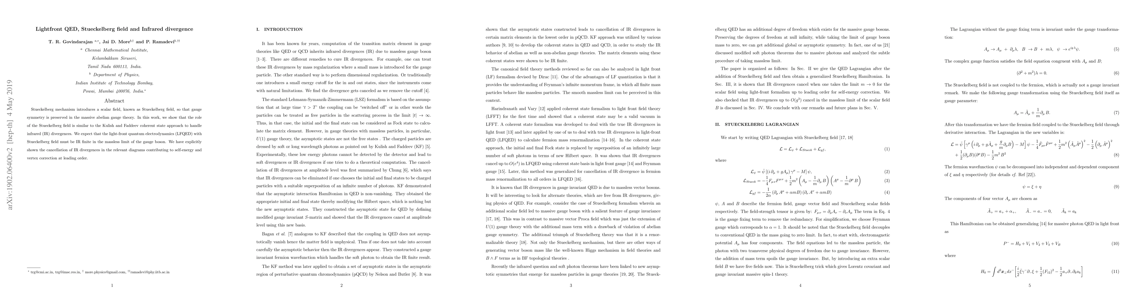 This paper demonstrates that the Stueckelberg field, introduced to maintain gauge symmetry in massive abelian gauge theory, plays a role analogous to the Kulish and Faddeev coherent state approach in managing infrared divergences. The study shows that light-front QED with the Stueckelberg field is infrared finite in the massless gauge boson limit, explicitly proving the cancellation of infrared divergences in relevant self-energy and vertex correction diagrams.