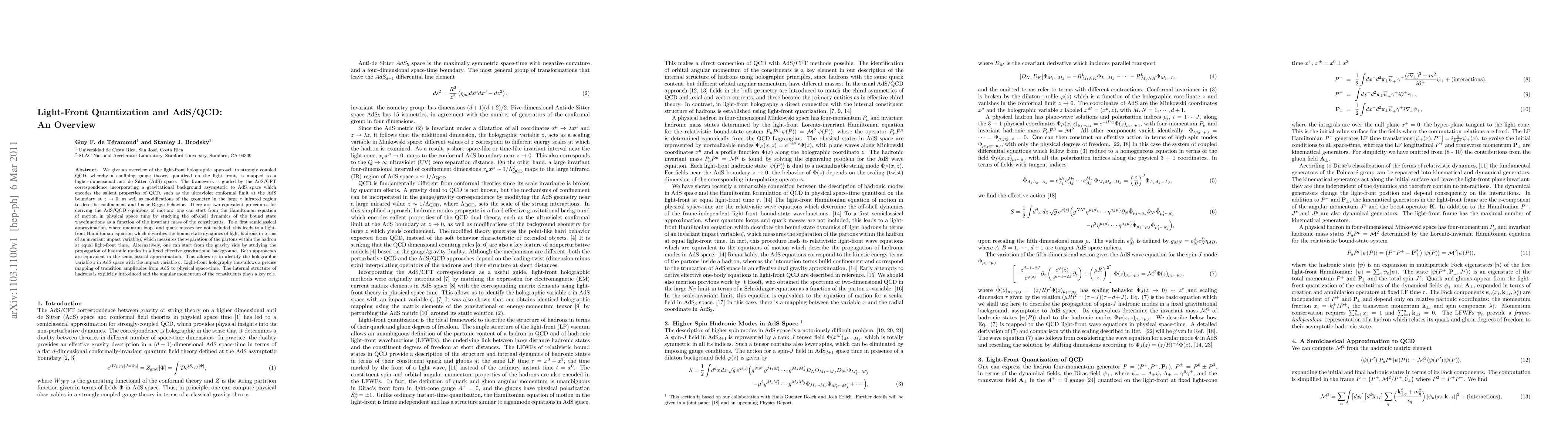 We give an overview of the light-front holographic approach to strongly coupled QCD, whereby a confining gauge theory, quantized on the light front, is mapped to a higher-dimensional anti de Sitter (AdS) space. The framework is guided by the AdS/CFT correspondence incorporating a gravitational background asymptotic to AdS space which encodes the salient properties of QCD, such as the ultraviolet conformal limit at the AdS boundary at $z \to 0$, as well as modifications of the geometry in the large $z$ infrared region to describe confinement and linear Regge behavior. There are two equivalent procedures for deriving the AdS/QCD equations of motion: one can start from the Hamiltonian equation of motion in physical space time by studying the off-shell dynamics of the bound state wavefunctions as a function of the invariant mass of the constituents. To a first semiclassical approximation, where quantum loops and quark masses are not included, this leads to a light-front Hamiltonian equation which describes the bound state dynamics of light hadrons in terms of an invariant impact variable $\zeta$ which measures the separation of the partons within the hadron at equal light-front time. Alternatively, one can start from the gravity side by studying the propagation of hadronic modes in a fixed effective gravitational background. Both approaches are equivalent in the semiclassical approximation. This allows us to identify the holographic variable $z$ in AdS space with the impact variable $\zeta$. Light-front holography thus allows a precise mapping of transition amplitudes from AdS to physical space-time. The internal structure of hadrons is explicitly introduced and the angular momentum of the constituents plays a key role.