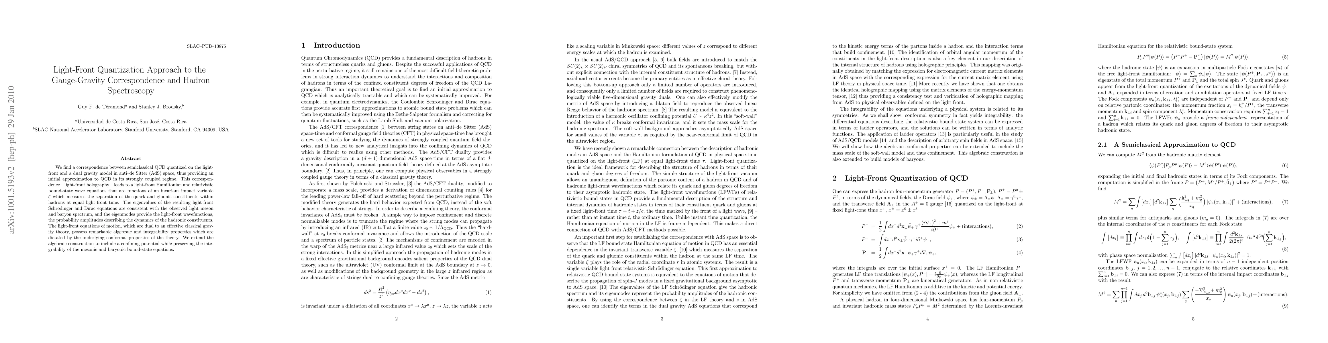 This paper establishes a light-front quantization approach to the gauge-gravity correspondence, linking semiclassical QCD to a dual gravity model in AdS space, and reveals a consistent spectrum of light mesons and baryons. The resulting light-front equations exhibit remarkable algebraic and integrability properties, preserving these features even with a confining potential.