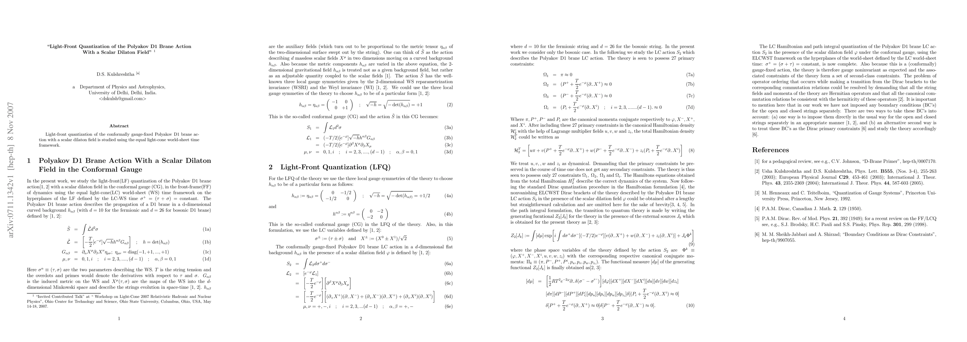 Light-front quantization of the conformally gauge-fixed Polyakov D1 brane action with a scalar dilaton field is studied using the equal light-cone world-sheet time framework.