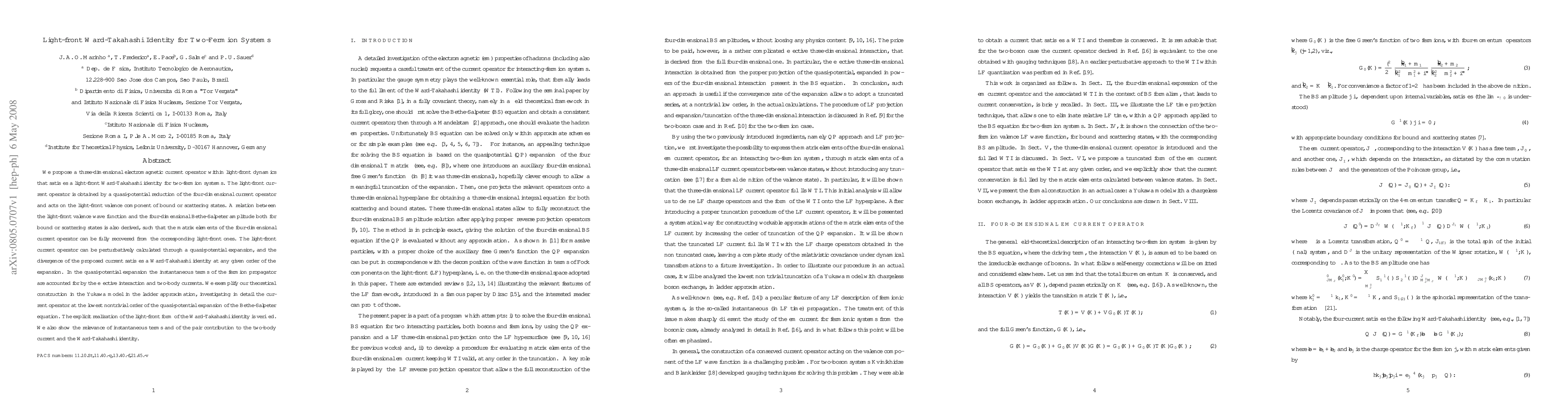 We propose a three-dimensional electromagnetic current operator within light-front dynamics that satisfies a light-front Ward-Takahashi identity for two-fermion systems. The light-front current operator is obtained by a quasi-potential reduction of the four-dimensional current operator and acts on the light-front valence component of bound or scattering states. A relation between the light-front valence wave function and the four-dimensional Bethe-Salpeter amplitude both for bound or scattering states is also derived, such that the matrix elements of the four-dimensional current operator can be fully recovered from the corresponding light-front ones. The light-front current operator can be perturbatively calculated through a quasi-potential expansion, and the divergence of the proposed current satisfies a Ward-Takahashi identity at any given order of the expansion. In the quasi-potential expansion the instantaneous terms of the fermion propagator are accounted for by the effective interaction and two-body currents. We exemplify our theoretical construction in the Yukawa model in the ladder approximation, investigating in detail the current operator at the lowest nontrivial order of the quasi-potential expansion of the Bethe-Salpeter equation. The explicit realization of the light-front form of the Ward-Takahashi identity is verified. We also show the relevance of instantaneous terms and of the pair contribution to the two-body current and the Ward-Takahashi identity.