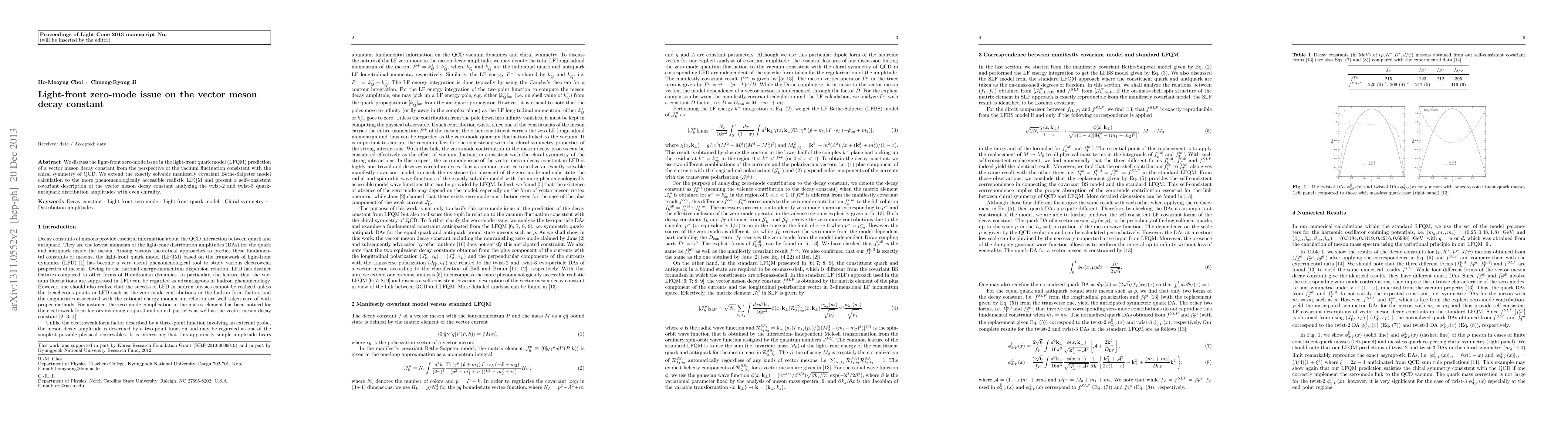We discuss the light-front zero-mode issue in the light-front quark model (LFQM) prediction of a vector meson decay constant from the perspective of the vacuum fluctuation consistent with the chiral symmetry of QCD. We extend the exactly solvable manifestly covariant Bethe-Salpeter model calculation to the more phenomenologically accessible realistic LFQM and present a self-consistent covariant description of the vector meson decay constant analyzing the twist-2 and twist-3 quark-antiquark distribution amplitudes with even chirality.