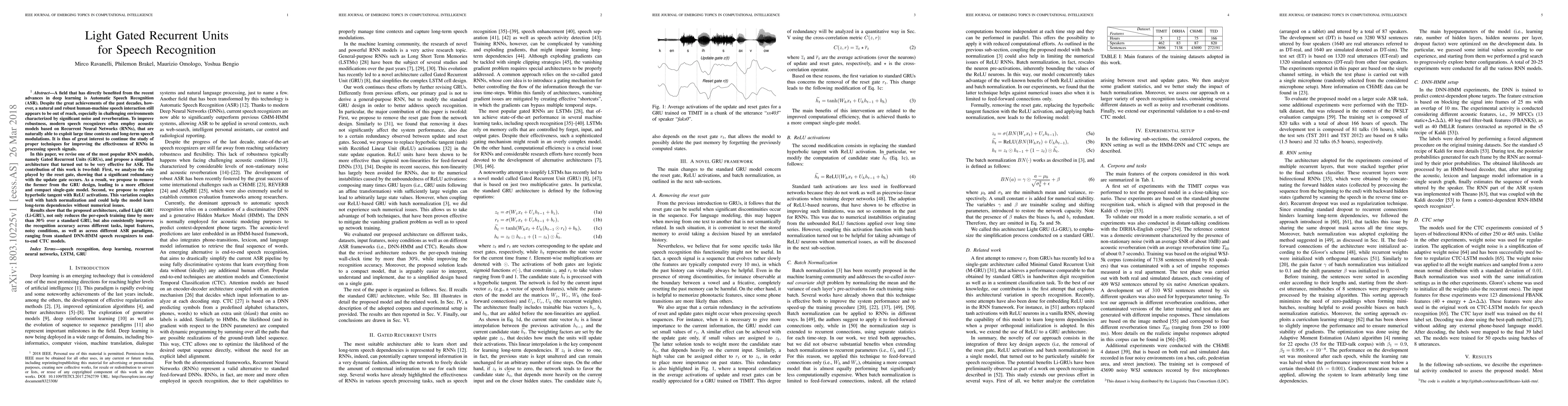 This paper proposes a simplified version of Gated Recurrent Units (GRUs) called Light GRU (Li-GRU) for improved Automatic Speech Recognition (ASR). The authors remove the reset gate and replace hyperbolic tangent with ReLU activations, resulting in a more efficient model that enhances recognition accuracy and reduces training time by over 30%.
