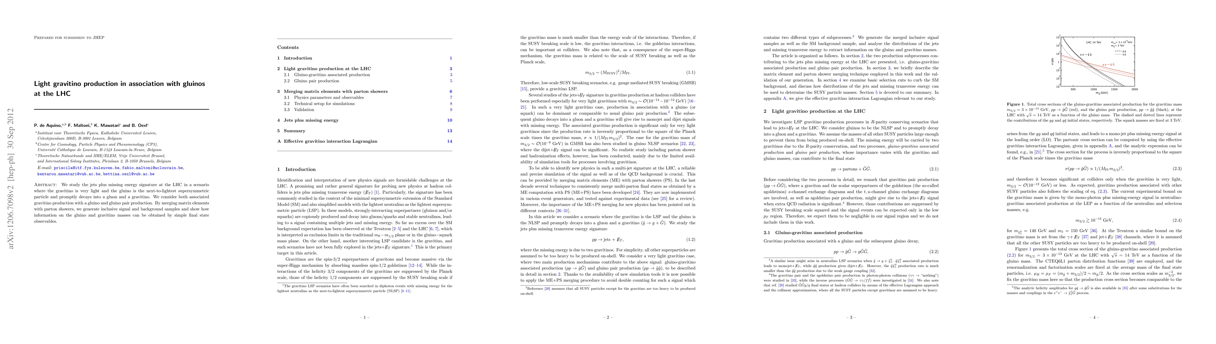This paper investigates the production of light gravitinos in association with gluinos at the LHC, focusing on the jets plus missing energy signature. It demonstrates how to extract information on gluino and gravitino masses using final state observables, merging matrix elements with parton showers for signal and background samples.