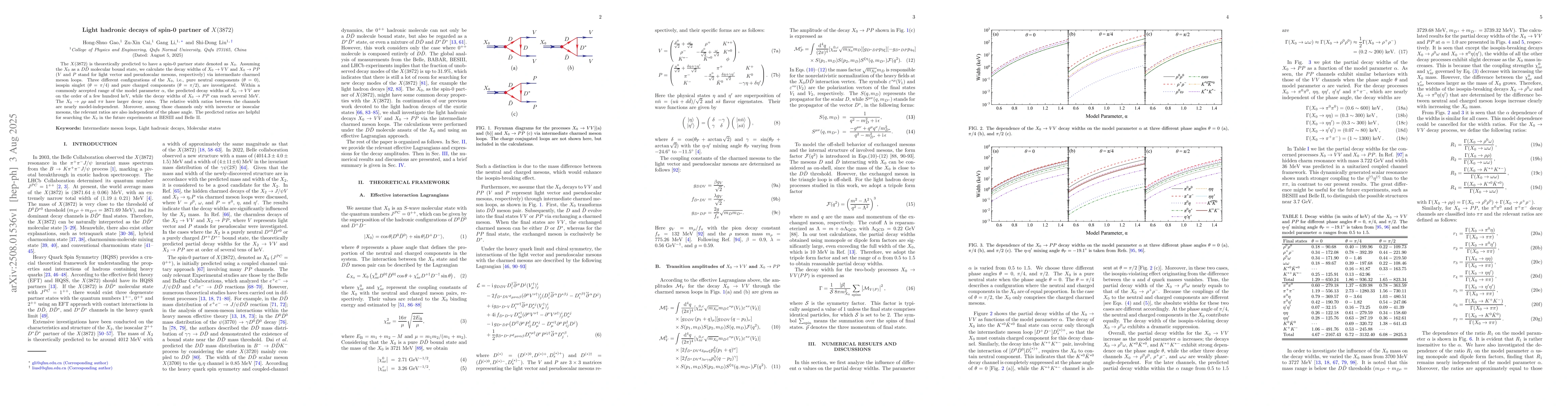 The $X(3872)$ is theoretically predicted to have a spin-0 partner state denoted as $X_0$. Assuming the $X_0$ as a $D\bar{D}$ molecular bound state, we calculate the decay widths of $X_0\to VV$ and $X_0 \to PP$ ($V$ and $P$ stand for light vector and pseudoscalar mesons, respectively) via intermediate charmed meson loops. Three different configurations of the $X_0$, i.e., pure neutral components ($\theta = 0$), isospin singlet ($\theta = \pi/4$) and pure charged components ($\theta = \pi/2$), are investigated. Within a commonly accepted range of the model parameter $\alpha$, the predicted decay widths of $X_0 \to VV$ are on the order of a few hundred $\mathrm{keV}$, while the decay widths of $X_0 \to PP$ can reach several $\mathrm{MeV}$. The $X_0 \to \rho\rho$ and $\pi\pi$ have larger decay rates. The relative width ratios between the channels are nearly model-independent. Moreover, among those channels only with isovector or isoscalar mesons, the relevant ratios are also independent of the phase angle. The predicted ratios are helpful for searching the $X_0$ in the future experiments at BESIII and Belle II.