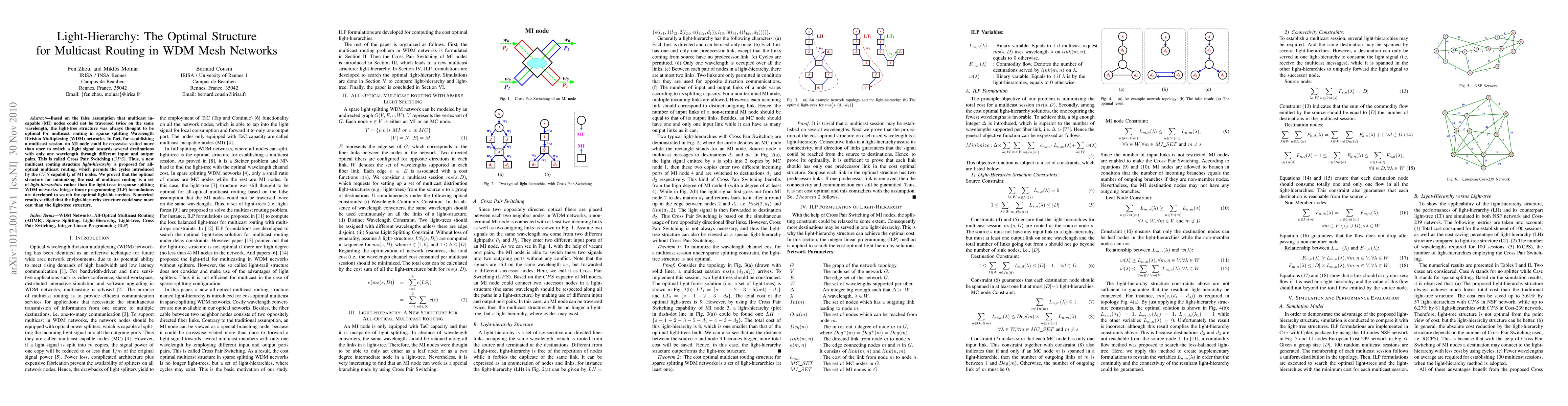 The paper proposes a new multicast routing structure called light-hierarchy for sparse splitting Wavelength Division Multiplexing (WDM) networks, which allows multicast incapable nodes to be visited more than once on the same wavelength through Cross Pair Switching. This structure is shown to be more cost-effective than the traditional light-tree structure, as verified by integer linear programming formulations and numerical results.