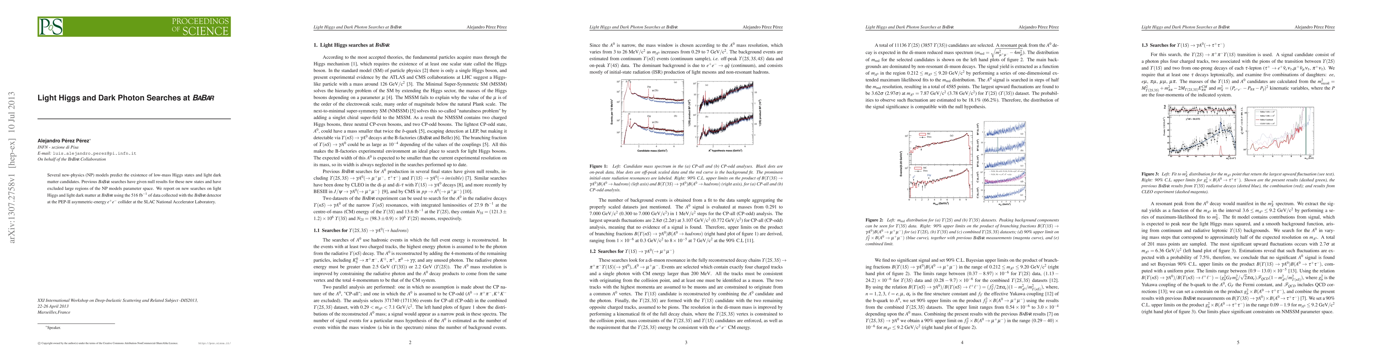 Several new-physics (NP) models predict the existence of low-mass Higgs states and light dark matter candidates. Previous BABAR searches have given null results for these new states and have excluded large regions of the NP models parameter space. We report on new searches on light Higgs and light dark matter at BABAR using the 516 1/fb of data collected with the BABAR detector at the PEP-II asymmetric-energy e+e- collider at the SLAC National Accelerator Laboratory.