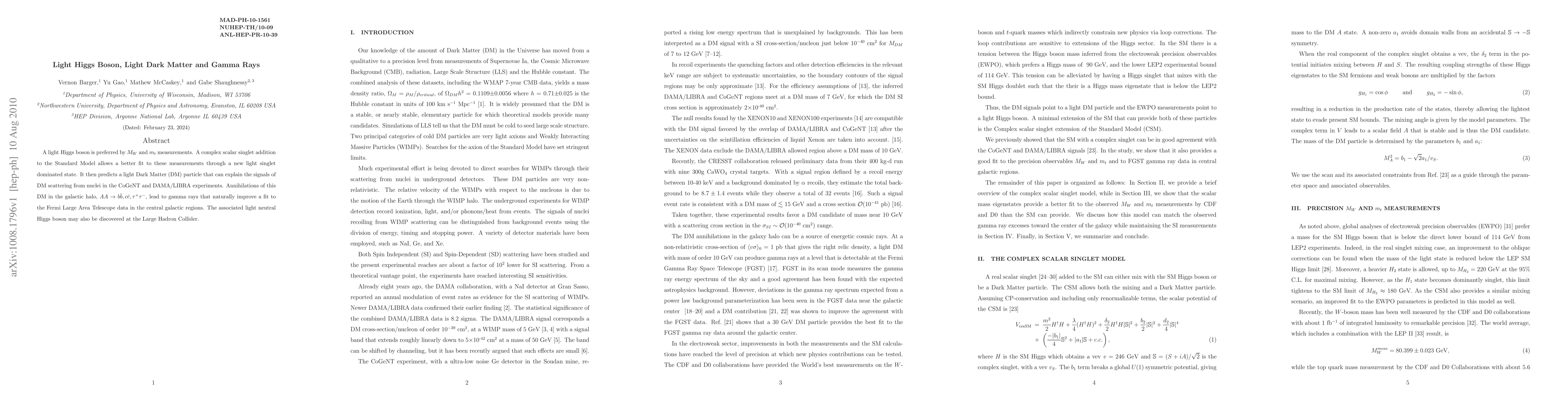 A light Higgs boson is preferred by $M_W$ and $m_t$ measurements. A complex scalar singlet addition to the Standard Model allows a better fit to these measurements through a new light singlet dominated state. It then predicts a light Dark Matter (DM) particle that can explain the signals of DM scattering from nuclei in the CoGeNT and DAMA/LIBRA experiments. Annihilations of this DM in the galactic halo, $AA\rightarrow b\bar{b}, c\bar{c}, \tau^+\tau^-$, lead to gamma rays that naturally improve a fit to the Fermi Large Area Telescope data in the central galactic regions. The associated light neutral Higgs boson may also be discovered at the Large Hadron Collider.