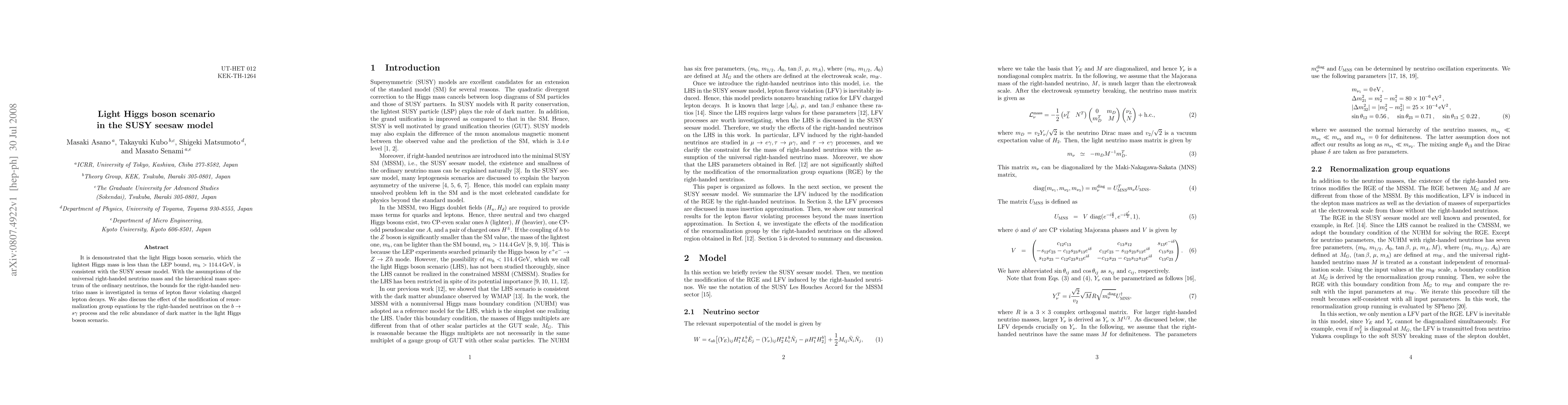This paper demonstrates that a light Higgs boson scenario, with a mass below the LEP bound, is consistent within the SUSY seesaw model. It investigates the implications of universal right-handed neutrino mass and hierarchical ordinary neutrino masses, focusing on lepton flavor violation, b to s gamma processes, and dark matter relic abundance.