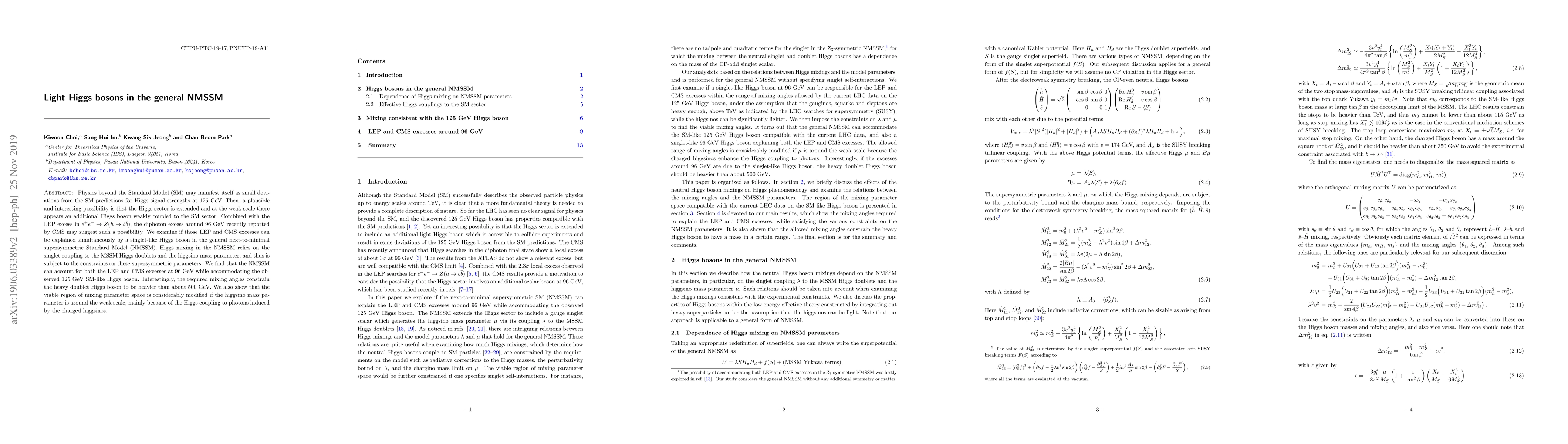 Physics beyond the Standard Model (SM) may manifest itself as small deviations from the SM predictions for Higgs signal strengths at 125 GeV. Then, a plausible and interesting possibility is that the Higgs sector is extended and at the weak scale there appears an additional Higgs boson weakly coupled to the SM sector. Combined with the LEP excess in $e^+e^-\to Z(h\to b\bar b)$, the diphoton excess around 96 GeV recently reported by CMS may suggest such a possibility. We examine if those LEP and CMS excesses can be explained simultaneously by a singlet-like Higgs boson in the general next-to-minimal supersymmetric Standard Model (NMSSM). Higgs mixing in the NMSSM relies on the singlet coupling to the MSSM Higgs doublets and the higgsino mass parameter, and thus is subject to the constraints on these supersymmetric parameters. We find that the NMSSM can account for both the LEP and CMS excesses at 96 GeV while accommodating the observed 125 GeV SM-like Higgs boson. Interestingly, the required mixing angles constrain the heavy doublet Higgs boson to be heavier than about 500 GeV. We also show that the viable region of mixing parameter space is considerably modified if the higgsino mass parameter is around the weak scale, mainly because of the Higgs coupling to photons induced by the charged higgsinos.