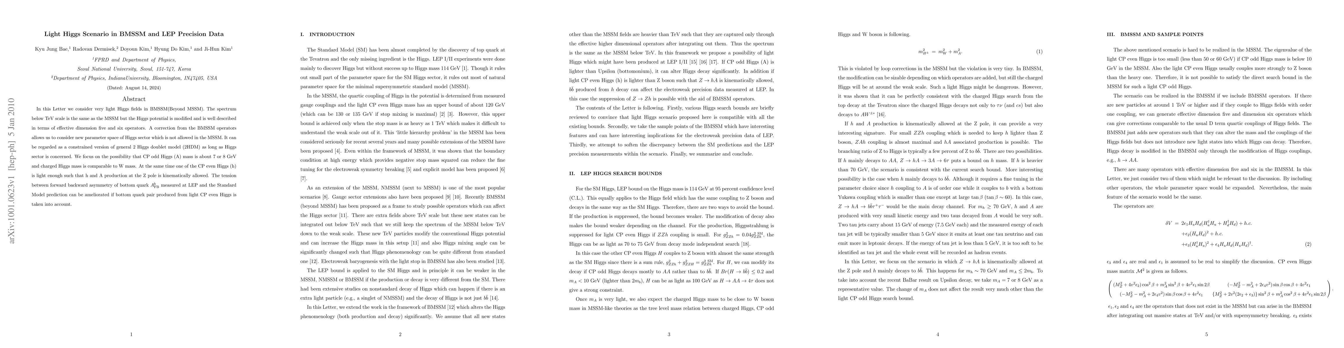 In this Letter we consider very light Higgs fields in BMSSM(Beyond MSSM). The spectrum below TeV scale is the same as the MSSM but the Higgs potential is modified and is well described in terms of effective dimension five and six operators. A correction from the BMSSM operators allows us to consider new parameter space of Higgs sector which is not allowed in the MSSM. It can be regarded as a constrained version of general 2 Higgs doublet model (2HDM) as long as Higgs sector is concerned. We focus on the possibility that CP odd Higgs (A) mass is about 7 or 8 GeV and charged Higgs mass is comparable to W mass. At the same time one of the CP even Higgs (h) is light enough such that h and A production at the Z pole is kinematically allowed. The tension between forward backward asymmetry of bottom quark Ab_FB measured at LEP and the Standard Model prediction can be ameliorated if bottom quark pair produced from light CP even Higgs is taken into account.