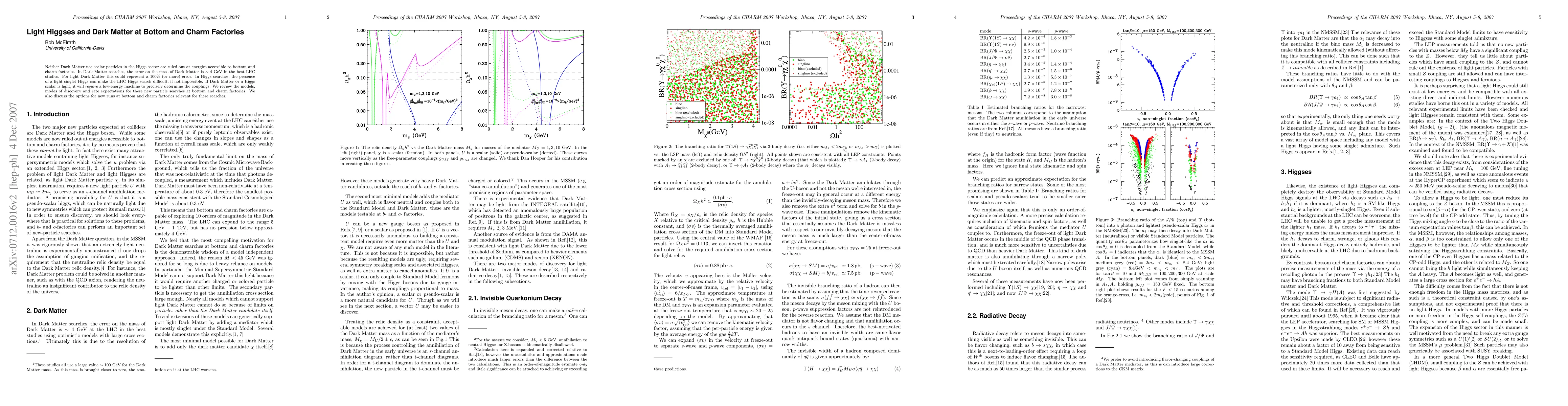 Neither Dark Matter nor scalar particles in the Higgs sector are ruled out at energies accessible to bottom and charm factories. In Dark Matter searches, the error on the mass of Dark Matter is $\sim 4$ GeV in the best LHC studies. For light Dark Matter this could represent a 100% (or more) error. In Higgs searches, the presence of a light singlet Higgs can make the LHC Higgs search difficult, if not impossible. If Dark Matter or a Higgs scalar is light, it will {\it require} a low-energy machine to precisely determine the couplings. We review the models, modes of discovery and rate expectations for these new particle searches at bottom and charm factories. We also discuss the options for new runs at bottom and charm factories relevant for these searches.
