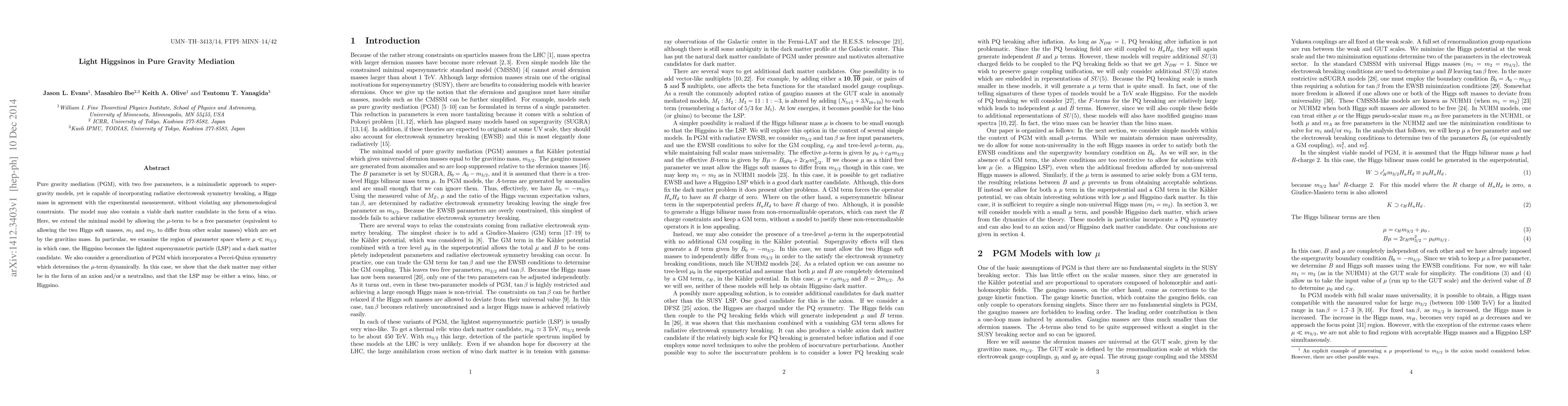 Pure gravity mediation (PGM), with two free parameters, is a minimalistic approach to supergravity models, yet is capable of incorporating radiative electroweak symmetry breaking, a Higgs mass in agreement with the experimental measurement, without violating any phenomenological constraints. The model may also contain a viable dark matter candidate in the form of a wino. Here, we extend the minimal model by allowing the $\mu$-term to be a free parameter (equivalent to allowing the two Higgs soft masses, $m_1$ and $m_2$, to differ from other scalar masses) which are set by the gravitino mass. In particular, we examine the region of parameter space where $\mu \ll m_{3/2}$ in which case, the Higgsino becomes the lightest supersymmetric particle (LSP) and a dark matter candidate. We also consider a generalization of PGM which incorporates a Peccei-Quinn symmetry which determines the $\mu$-term dynamically. In this case, we show that the dark matter may either be in the form of an axion and/or a neutralino, and that the LSP may be either a wino, bino, or Higgsino.
