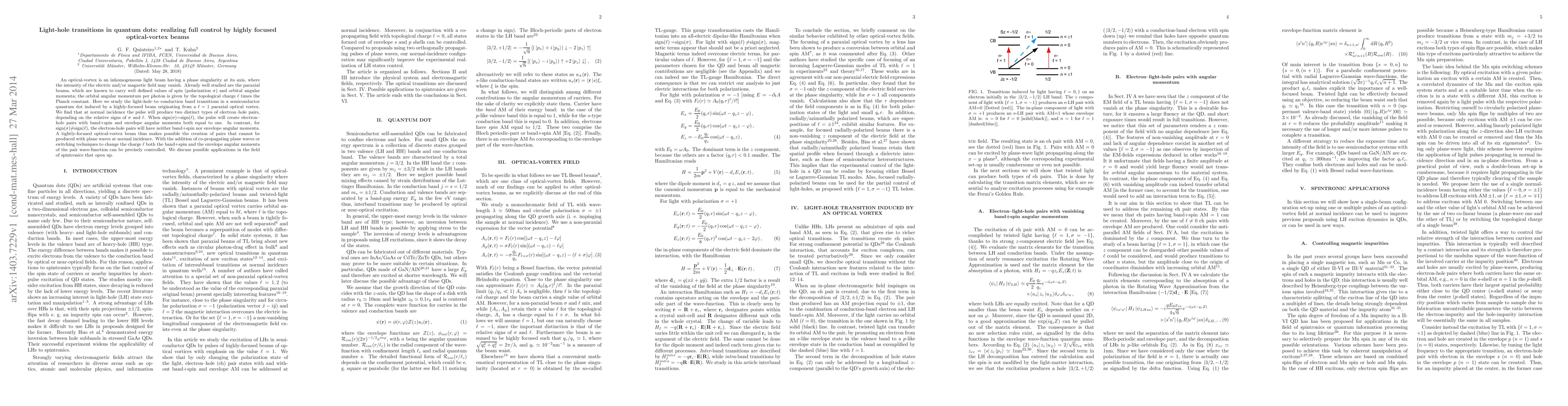 An optical-vortex is an inhomogeneous light beam having a phase singularity at its axis, where the intensity of the electric and/or magnetic field may vanish. Already well studied are the paraxial beams, which are known to carry well defined values of spin (polarization $\sigma$) and orbital angular momenta; the orbital angular momentum per photon is given by the topological charge $\ell$ times the Planck constant. Here we study the light-hole--to--conduction band transitions in a semiconductor quantum dot induced by a highly-focused beam originating from a $\ell=1$ paraxial optical vortex. We find that at normal incidence the pulse will produce two distinct types of electron--hole pairs, depending on the relative signs of $\sigma$ and $\ell$. When sign($\sigma$)$=$sign($\ell$), the pulse will create electron--hole pairs with band+spin and envelope angular momenta both equal to one. In contrast, for sign($\sigma$)$\neq$sign($\ell$), the electron-hole pairs will have neither band+spin nor envelope angular momenta. A tightly-focused optical-vortex beam thus makes possible the creation of pairs that cannot be produced with plane waves at normal incidence. With the addition of co-propagating plane waves or switching techniques to change the charge $\ell$ both the band+spin and the envelope angular momenta of the pair wave-function can be precisely controlled. We discuss possible applications in the field of spintronics that open up.