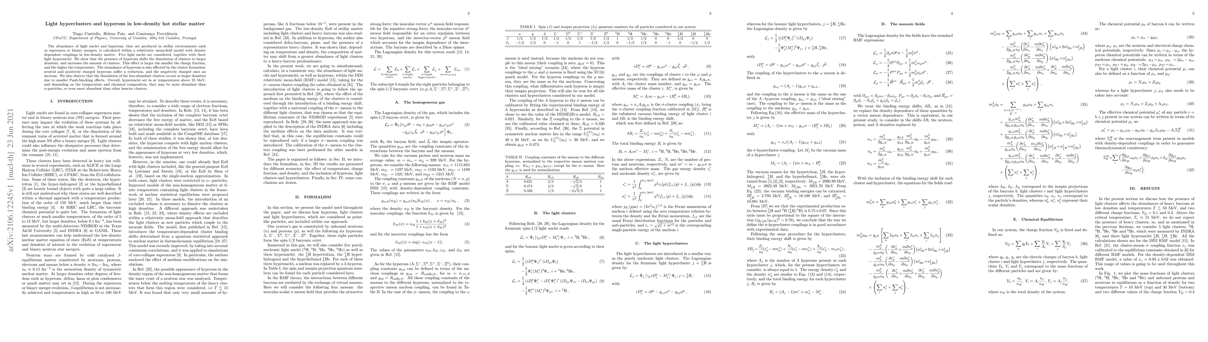 The abundance of light nuclei and hyperons, that are produced in stellar environments such as supernova or binary mergers, is calculated within a relativistic mean-field model with density dependent couplings in low-density matter. Five light nuclei are considered, together with three light hyper-nuclei. We show that the presence of hyperons shifts the dissolution of clusters to larger densities, and increases the amount of clusters. This effect is larger the smaller the charge fraction, and the higher the temperature. The abundance of hyperons is also affected by the cluster formation: neutral and positively charged hyperons suffer a reduction, and the negatively charged ones an increase. We also observe that the dissolution of the less-abundant clusters occurs at larger densities due to smaller Pauli-blocking effects. Overall, hyper-nuclei set in at temperatures above 25 MeV, and depending on the temperature and chemical composition, they may be more abundant than $\alpha$-particles, or even more abundant than other heavier clusters.